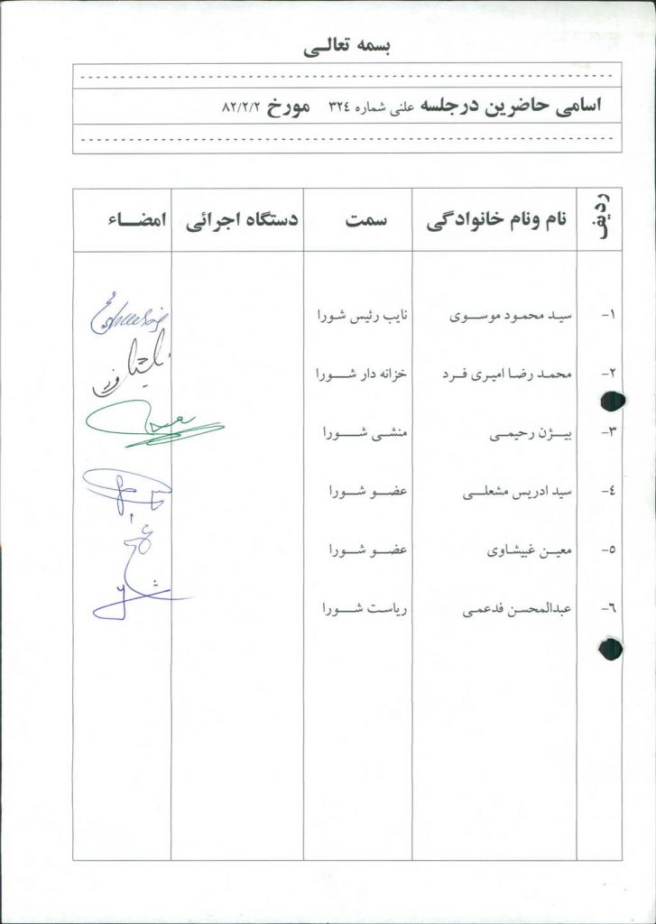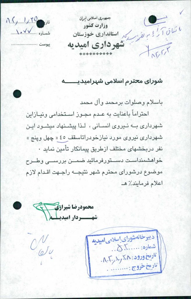 مصوبه شماره ۱ جلسه شماره ۳۲۴ مورخ ۸۲/۲/۲ شورای اسلامی شهر امیدیه