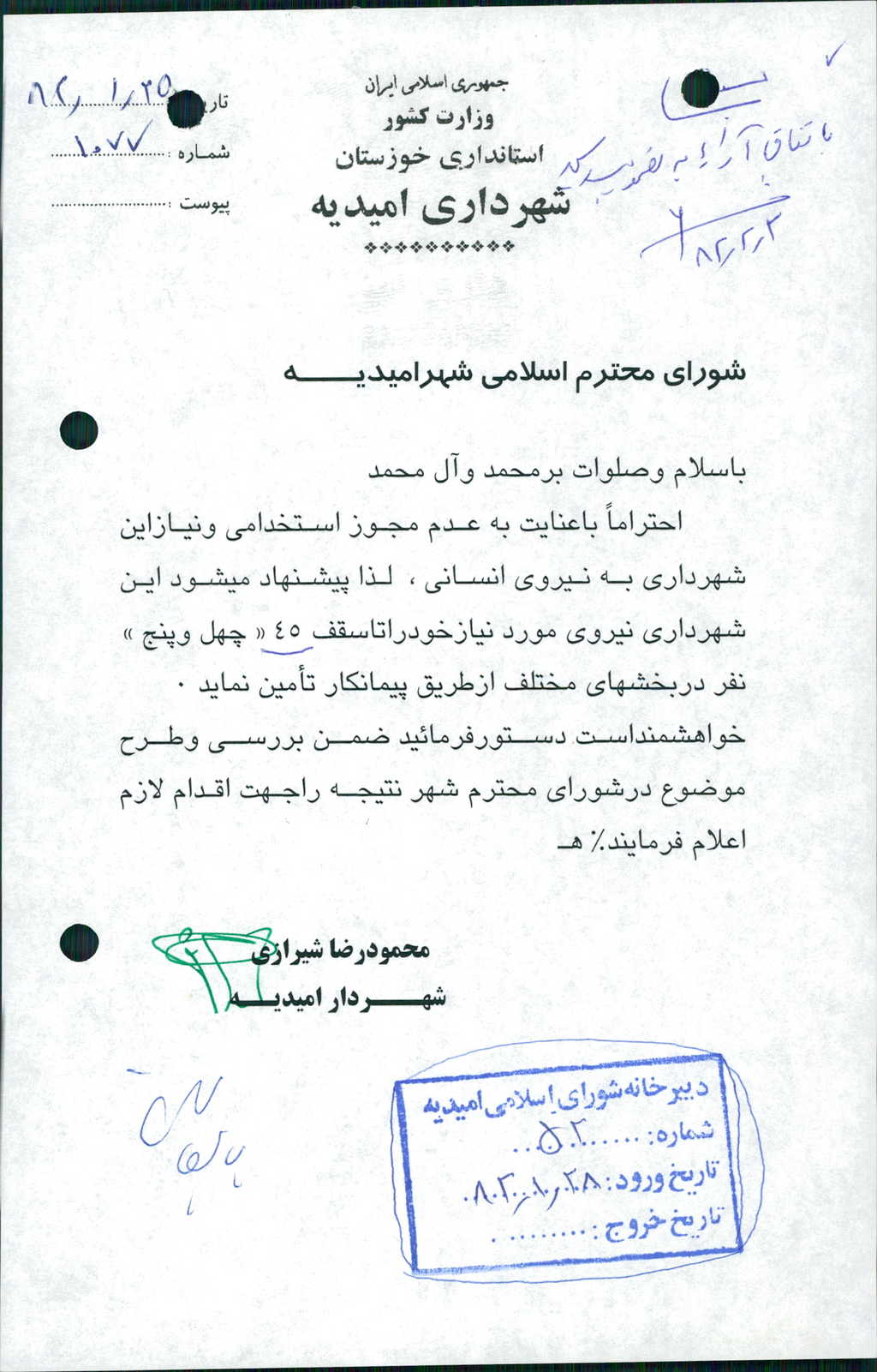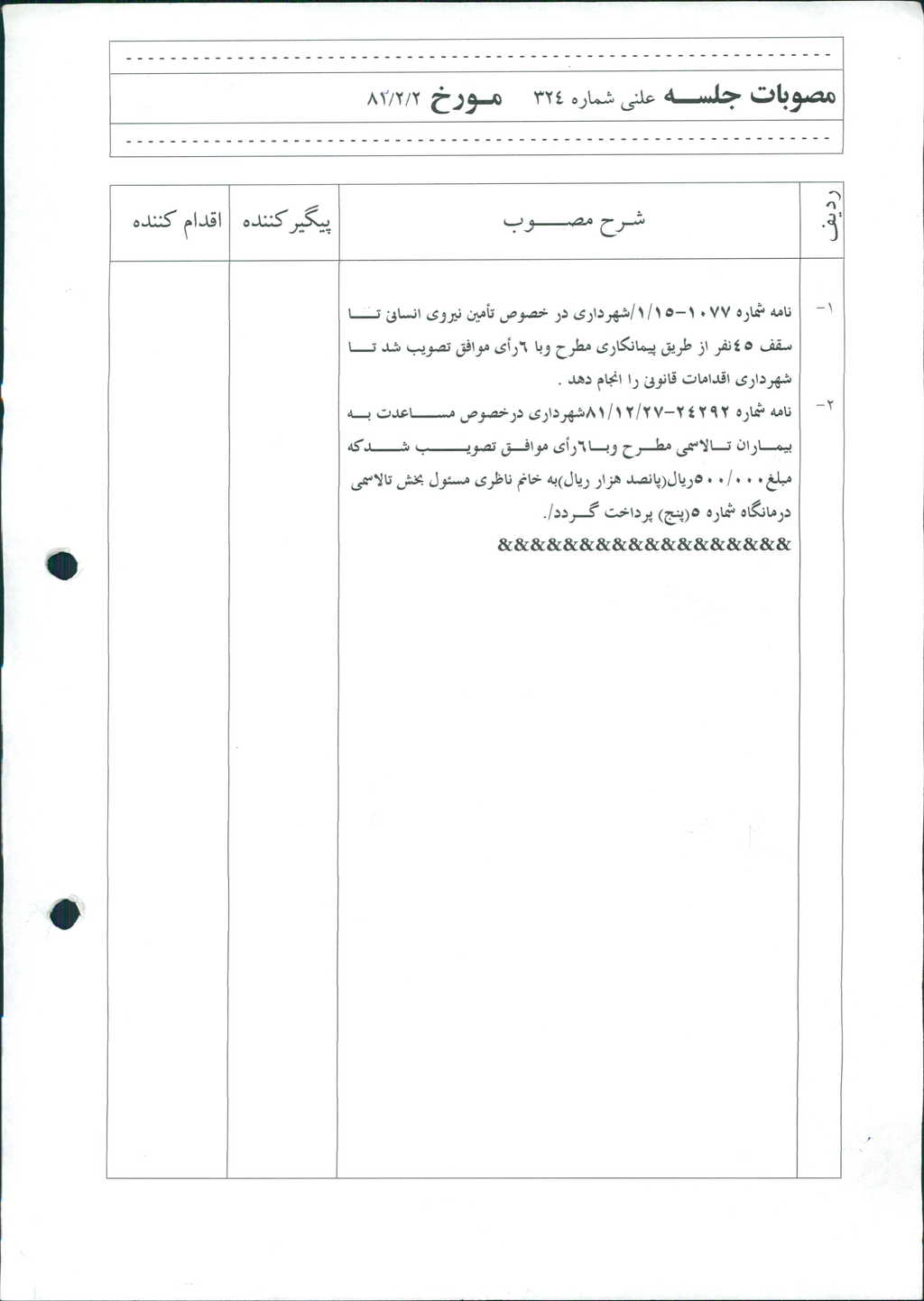 ۱-نامه شماره ۱۰۷۷-۲۵/ ۱/ ۸۲شهرداري در خصوص تأمين نيروي انساني تا سقف ۴۵نفر از طريق پيمانكاري مطرح وبا ۶رأي موافق تصويب شد تا شهرداري اقدامات قانوني را انجام دهد.