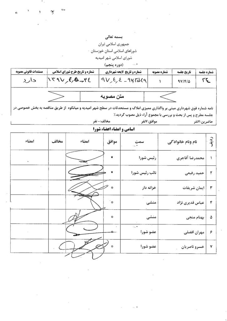 مصوبه شماره ۱ جلسه شماره ۳۴ شورای اسلامی شهر امیدیه