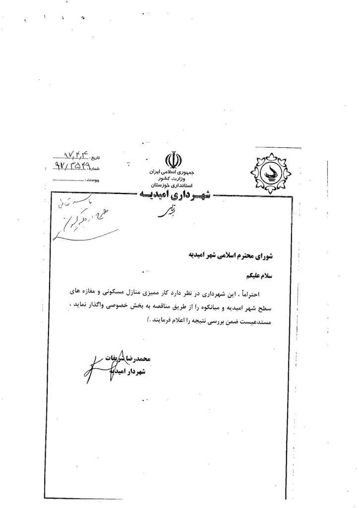 نامه شماره فوق شهرداری مبنی بر واگذاری ممیزی املاک و مستحدثات در سطح شهر امیدیه و میانکوه  از طریق مناقصه به بخش خصوصی در جلسه مطرح و پس از بحث و بررسی با مجموع آراء ذیل مصوب گردید%