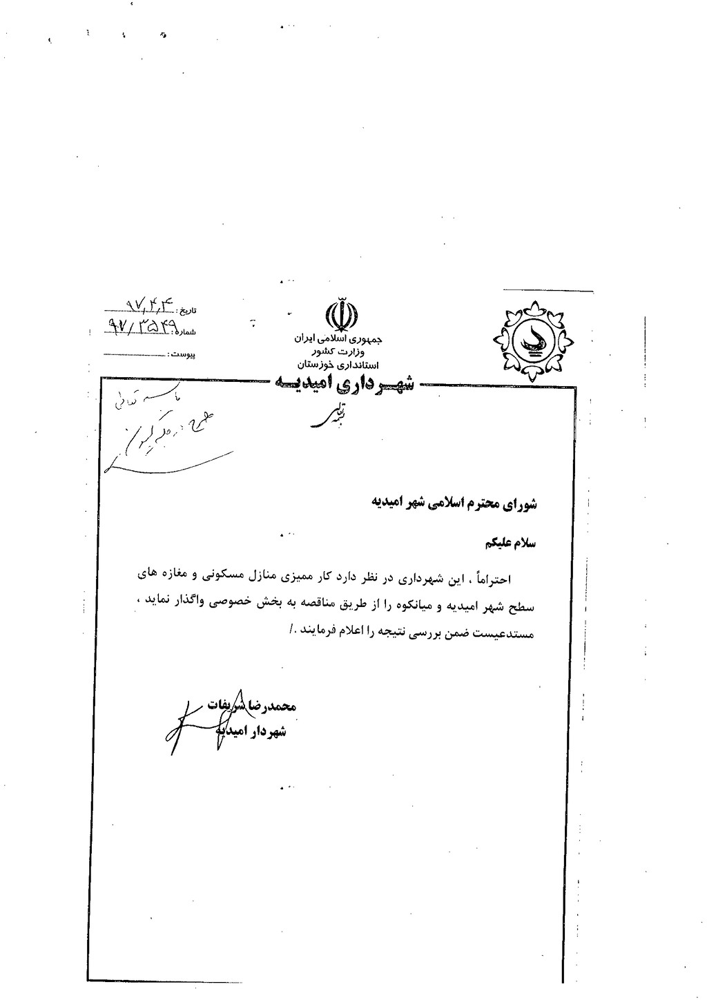 مصوبه شماره ۱ جلسه شماره ۳۴ مورخ ۹۷/۴/۵ شورای اسلامی شهر امیدیه