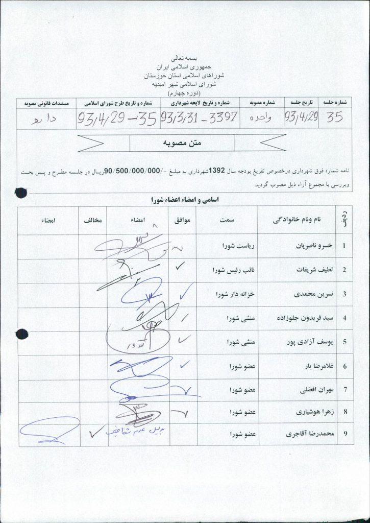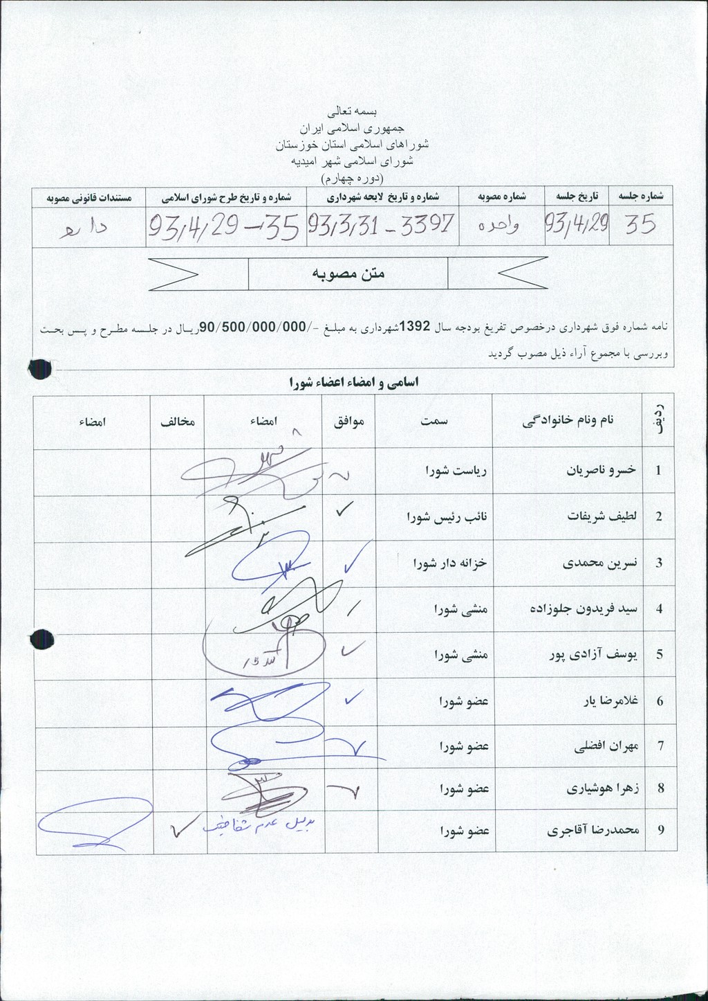 مصوبه شماره ۱ جلسه شماره ۳۵ مورخ ۹۳/۴/۲۹ شورای اسلامی شهر امیدیه