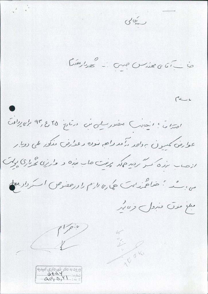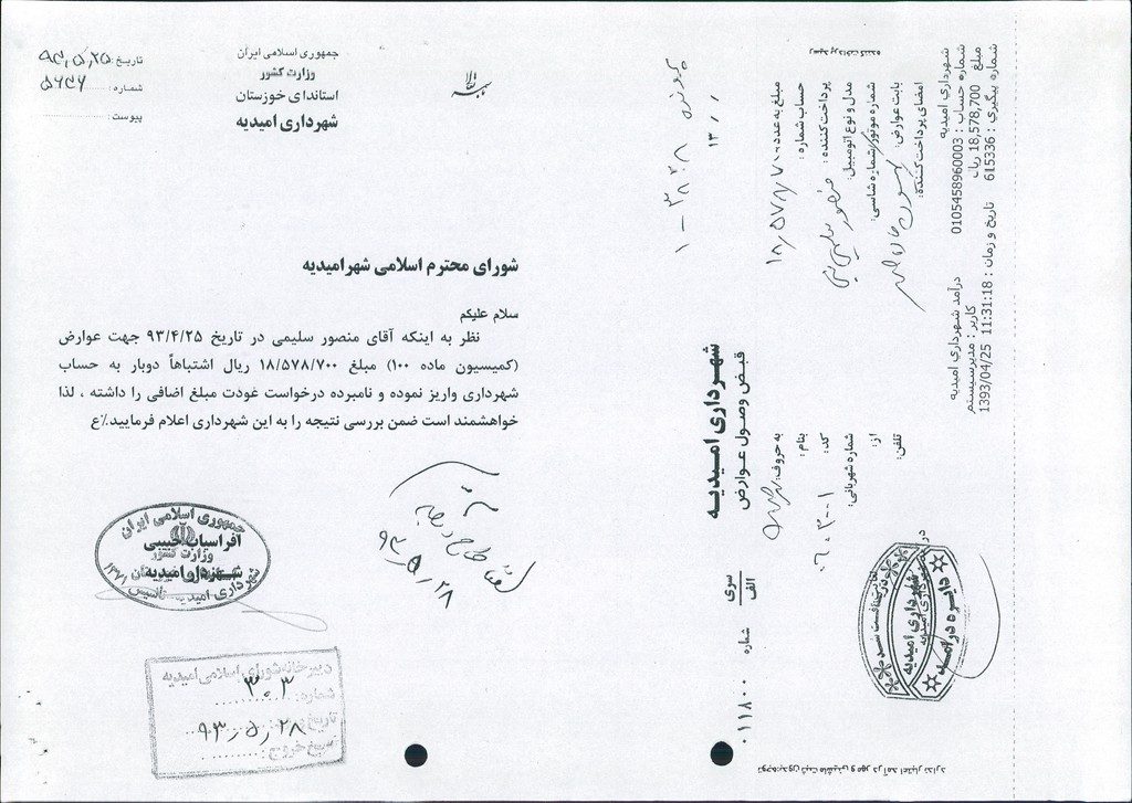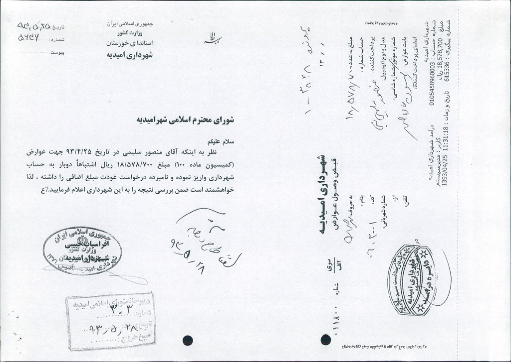 نامه شماره فوق شهرداری درخصوص در خواست استرداد مبلغ ۱۸۵۷۸۷۰۰ ريال وجه واریزی آقای منصور سلیمی  بابت عوارض(کمیسیون ماده ۱۰۰)که اشتباهاً دوبار به حساب شهرداری واریزشده بود ، در جلسه مطرح و پس از بحث و بررسی با مجموع آراء ذیل مصوب گردید%