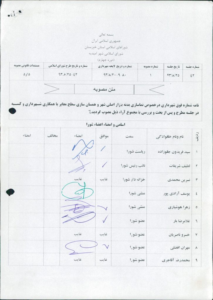 مصوبه شماره ۱ جلسه شماره ۴۲ شورای اسلامی شهر امیدیه