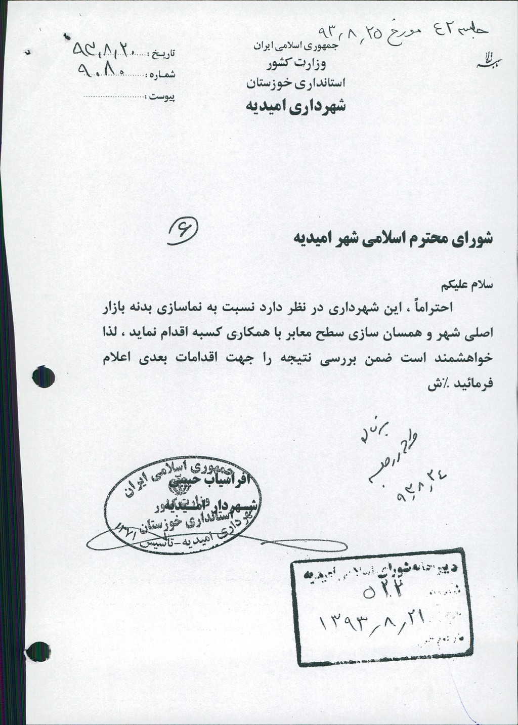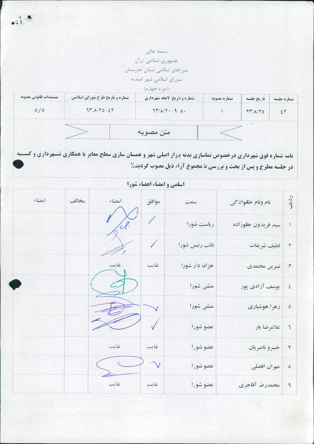 مصوبه شماره ۱ جلسه شماره ۴۲ مورخ ۹۳/۸/۲۵ شورای اسلامی شهر امیدیه