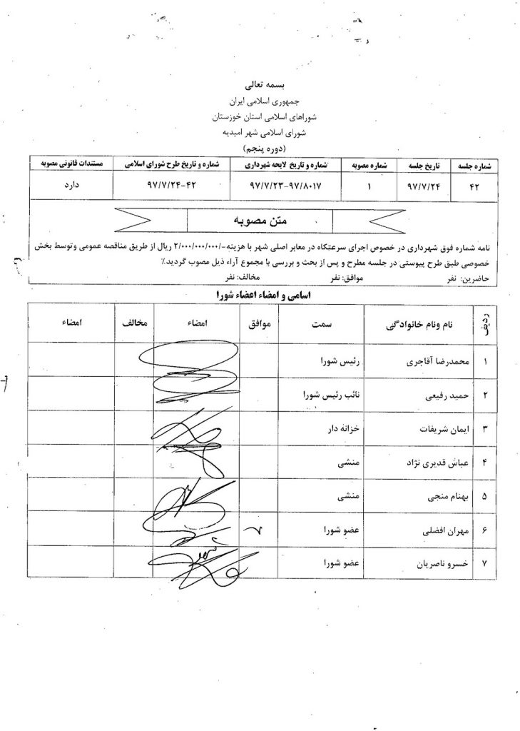 مصوبه شماره ۱ جلسه شماره ۴۲ شورای اسلامی شهر امیدیه