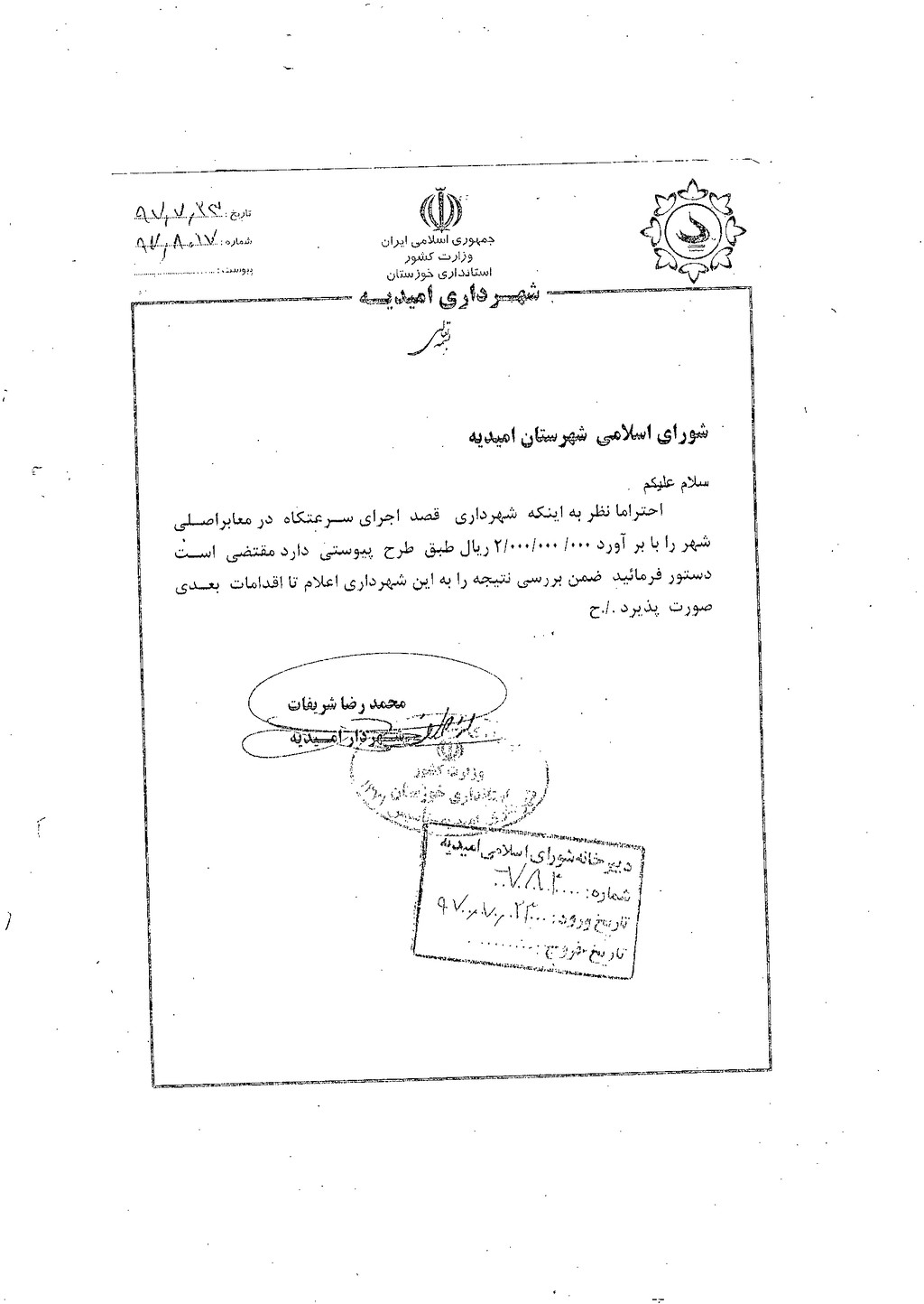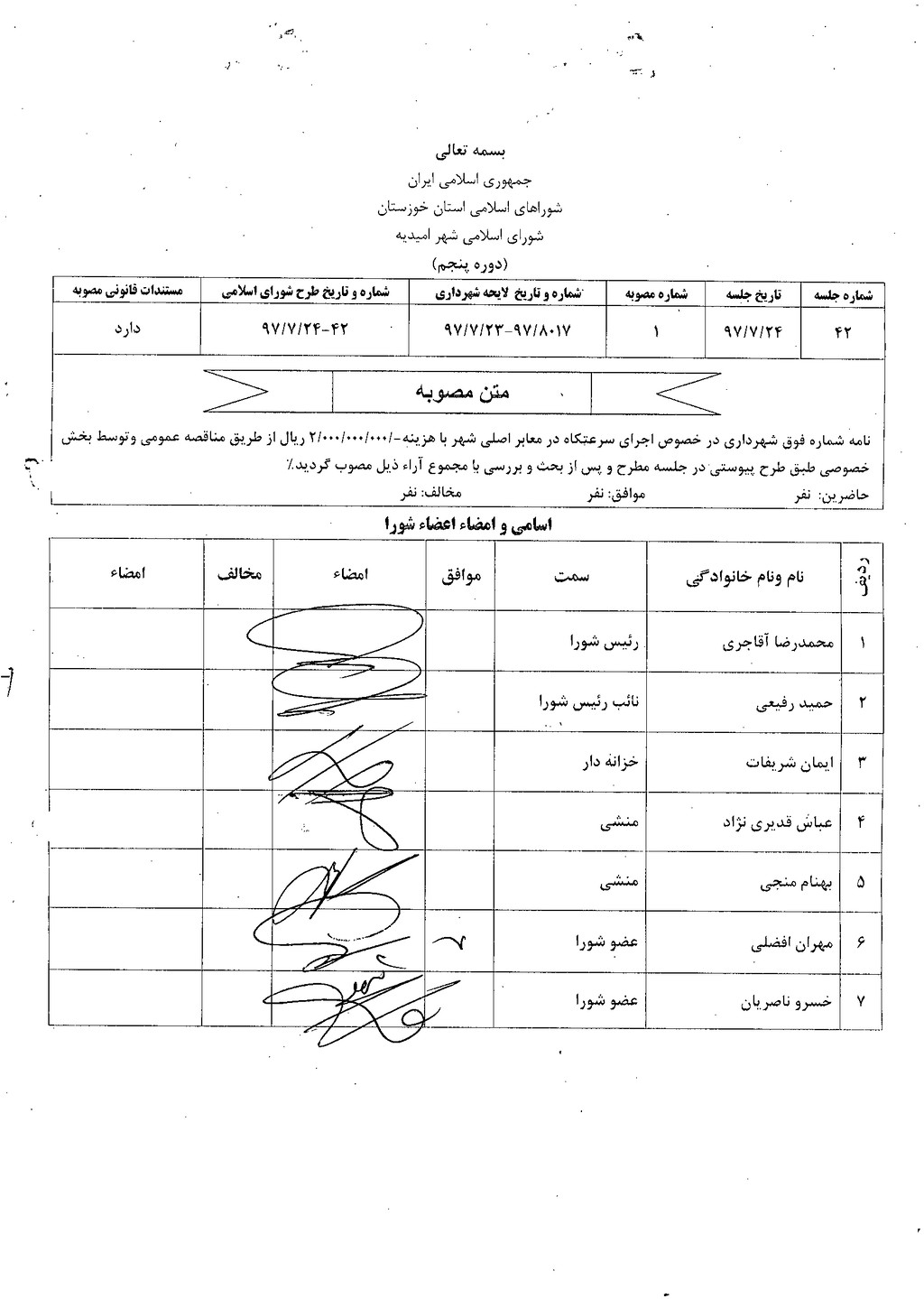 مصوبه شماره ۱ جلسه شماره ۴۲ مورخ ۹۷/۷/۲۴ شورای اسلامی شهر امیدیه