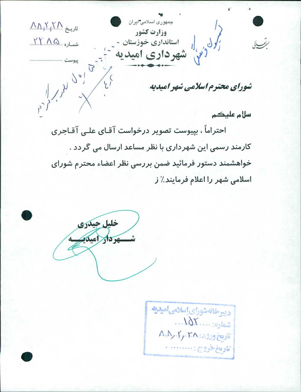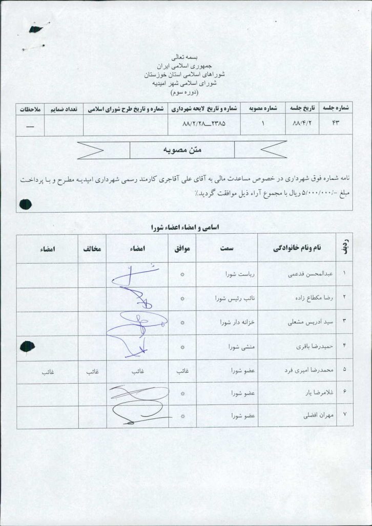 نامه شماره فوق شهرداری در خصوص مساعدت مالی به آقای علی آقاجری کارمند رسمی شهرداری امیدیه مطرح و با پرداخت مبلغ ۵۰۰۰۰۰۰ ریال با مجموع آراء ذیل موافقت گردید%