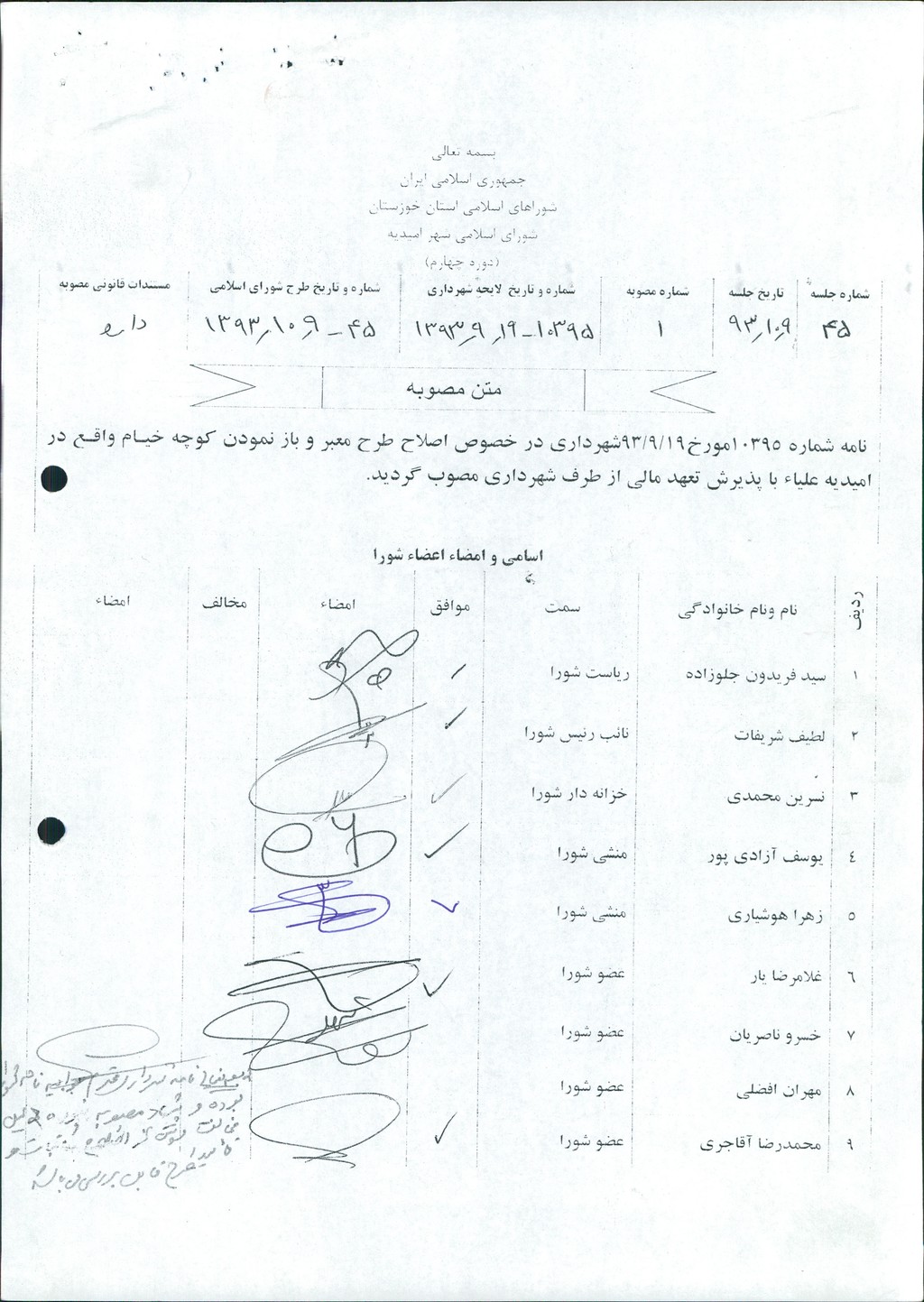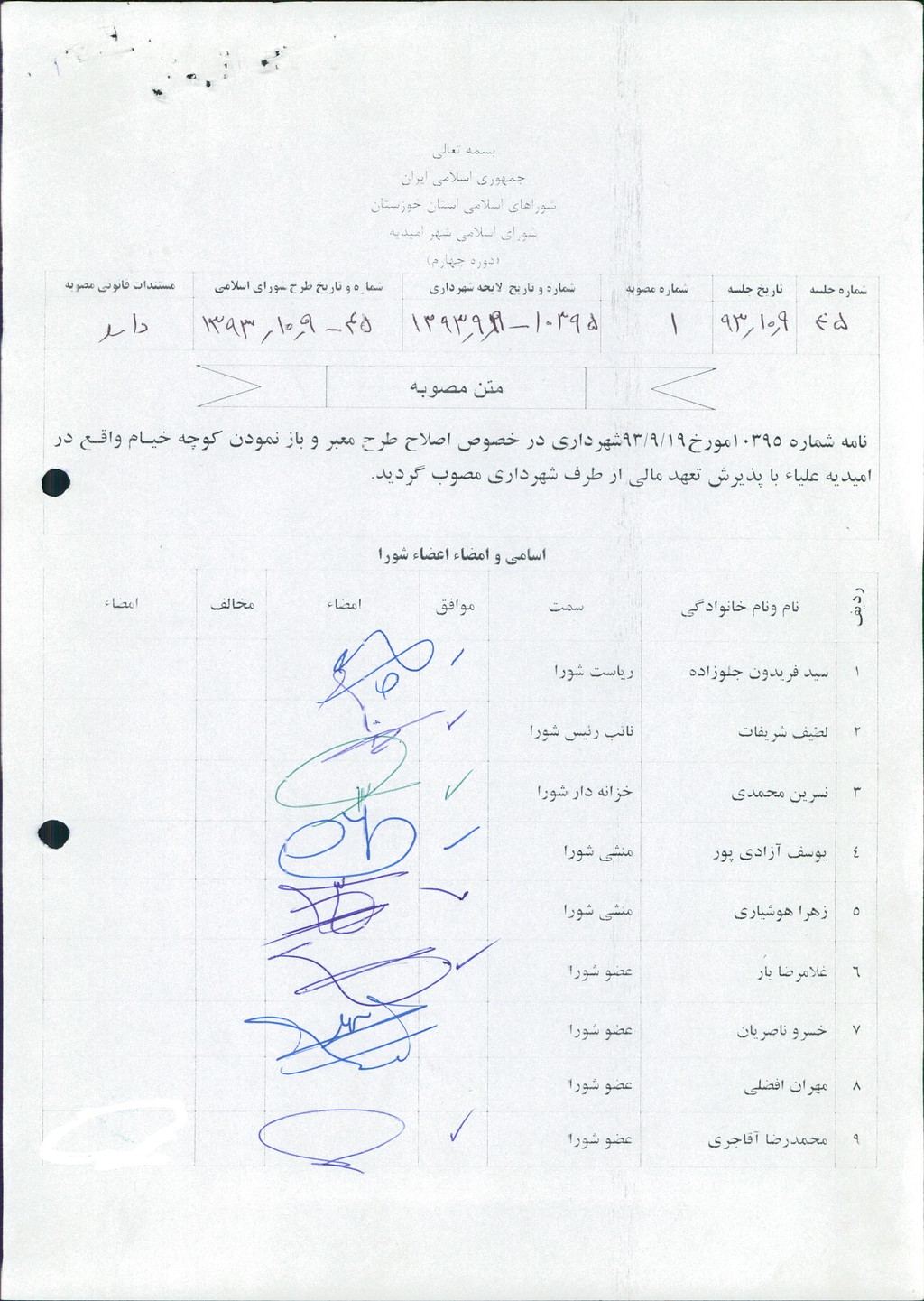 مصوبه شماره ۱ جلسه شماره ۴۵ مورخ ۹۳/۱۰/۹ شورای اسلامی شهر امیدیه