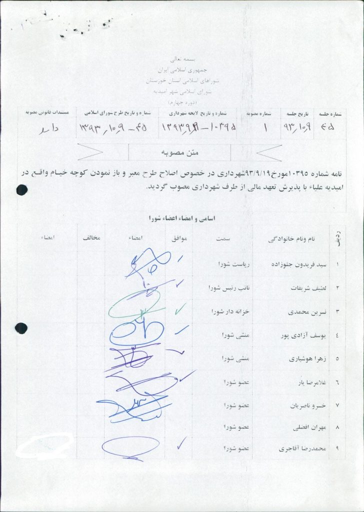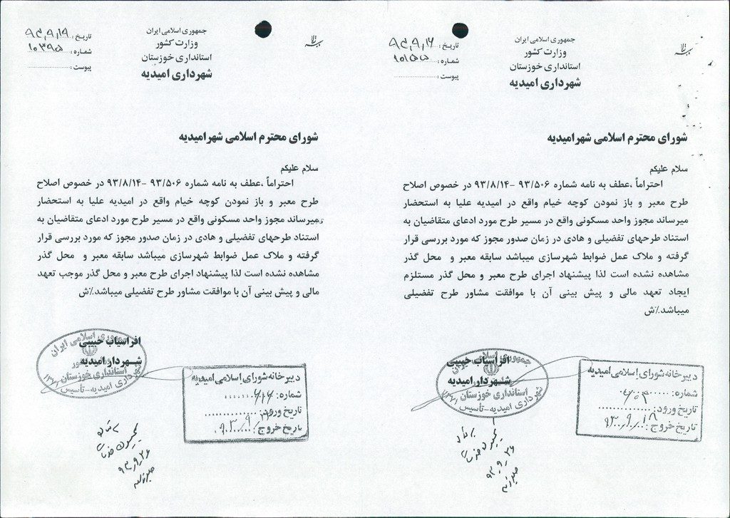 نامه شماره ۱۰۳۹۵مورخ۱۹/۹/۹۳شهرداری در خصوص اصلاح طرح معبر و باز نمودن کوچه خیام واقع در امیدیه علیاء با پذیرش تعهد مالی مصوب گردید.