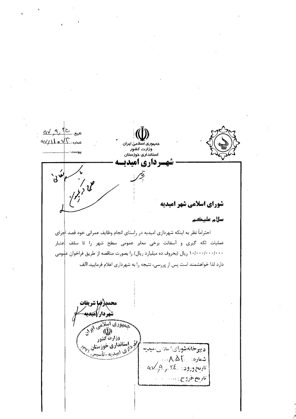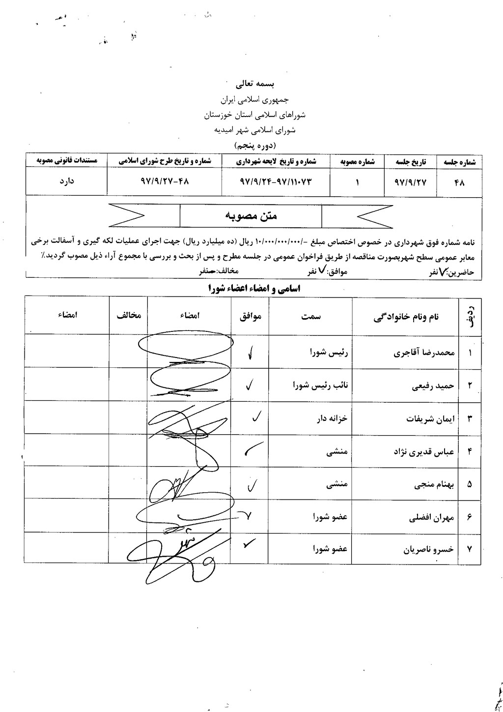مصوبه شماره ۱ جلسه شماره ۴۸ شورای اسلامی شهر امیدیه