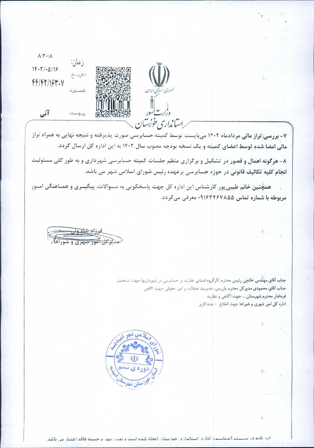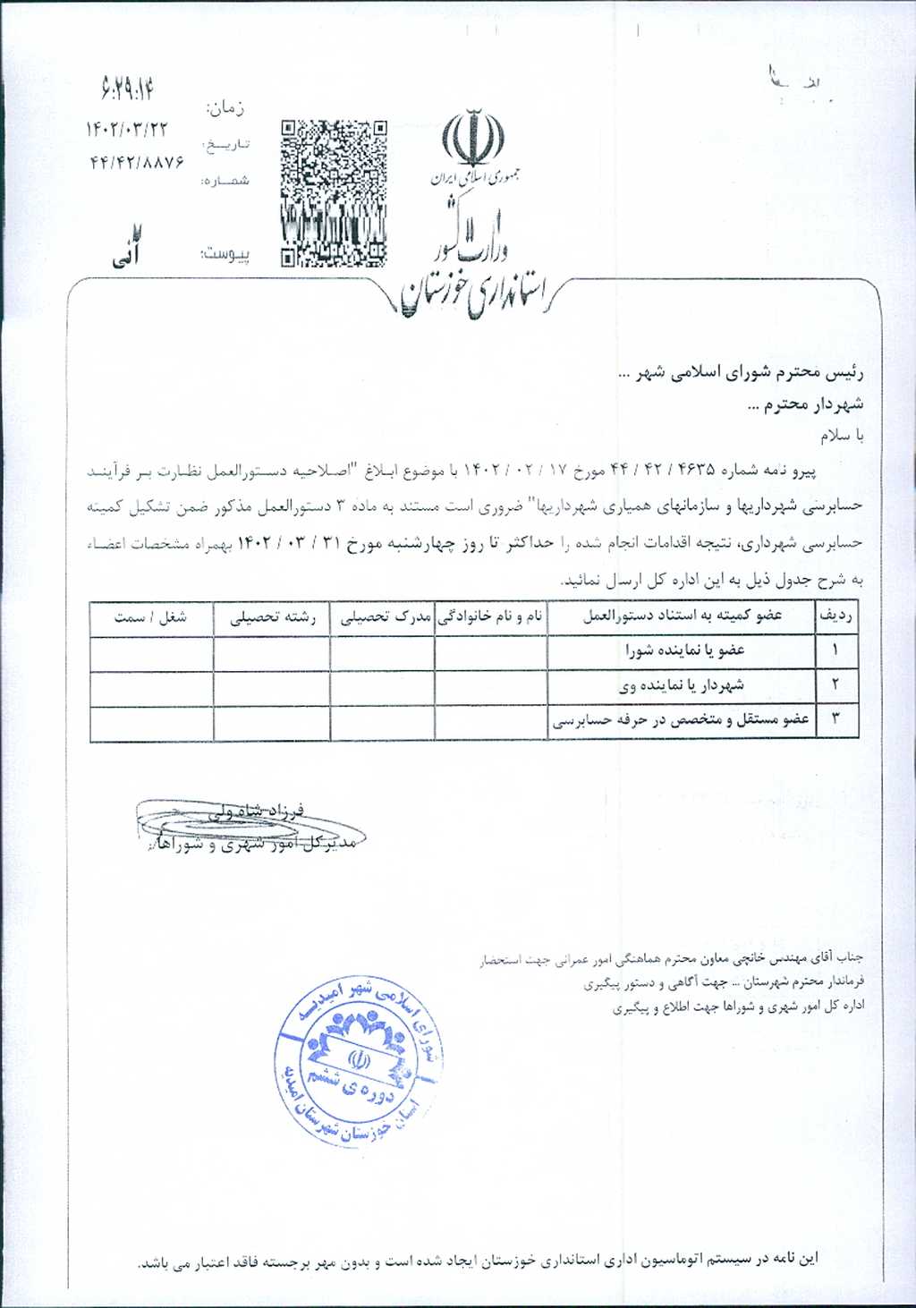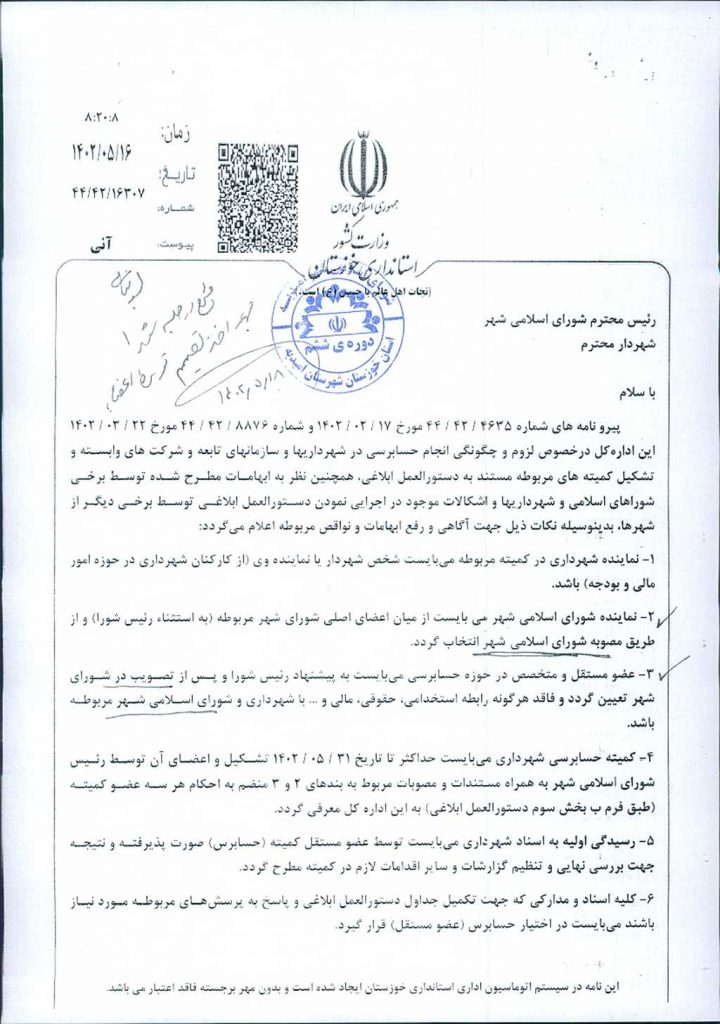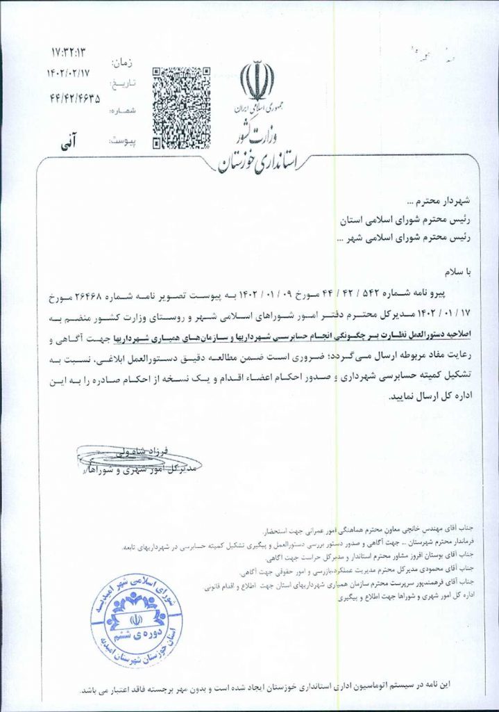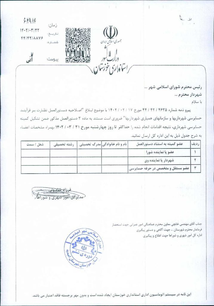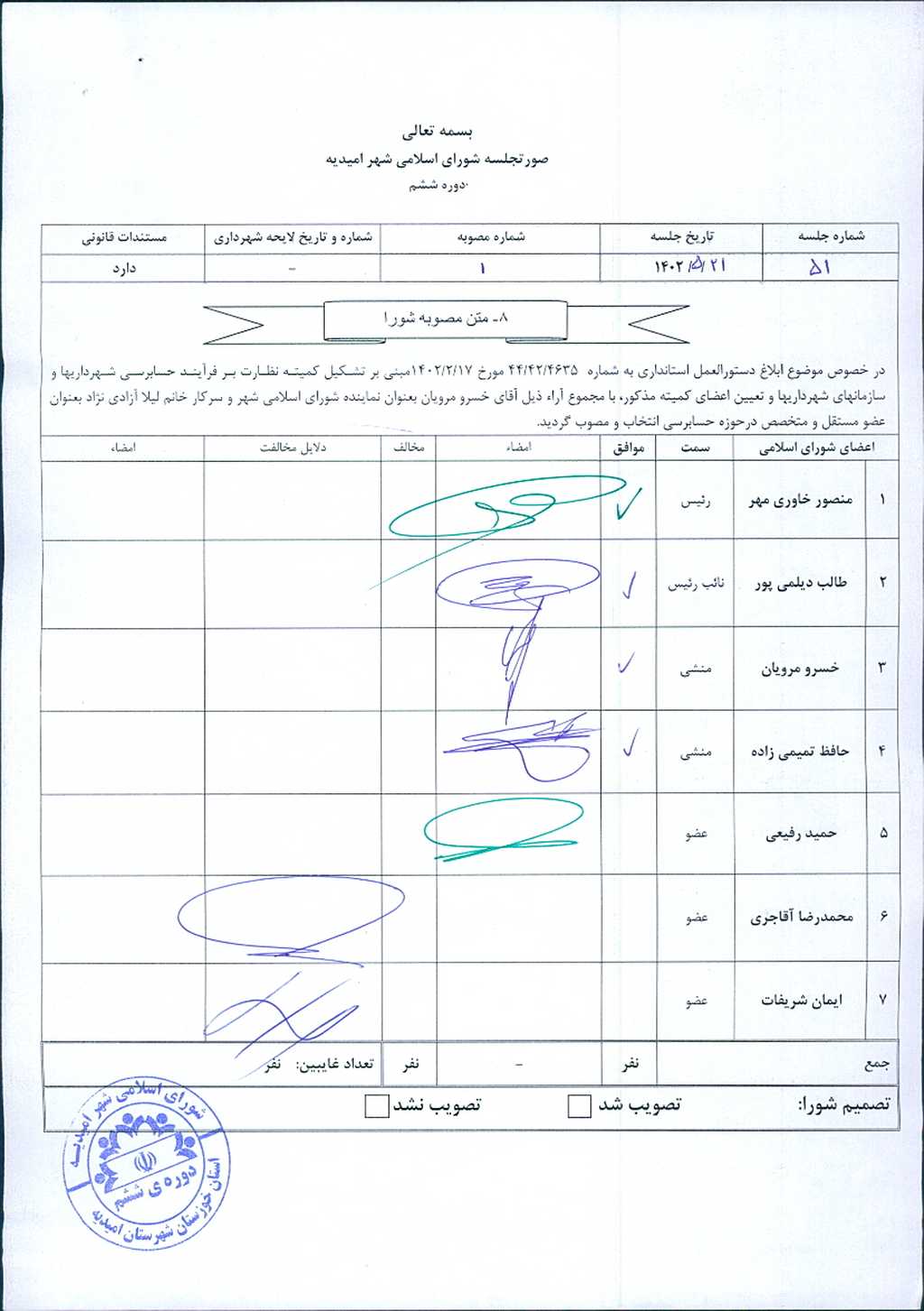 مصوبه شماره ۱ جلسه شماره ۵۱ شورای اسلامی شهر امیدیه