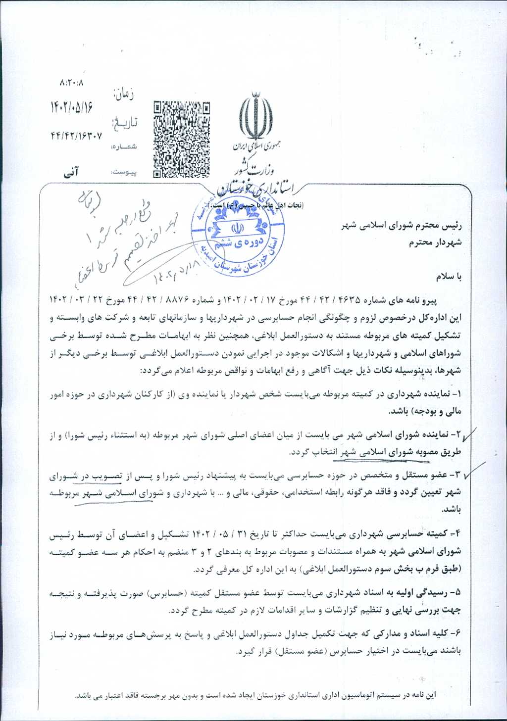 در خصوص موضوع ابلاغ دستورالعمل استانداری به شماره ۴۶۳۵/ ۴۲/ ۴۴ مورخ ۱۷ /۲/ ۱۴۰۲ مبنی بر تشکیل کمیته نظارت بر فرآیند حسابرسی شهرداریها و سازمانهای شهرداریها و تعیین اعضای کمیته مذکور، با مجموع آراء ذیل آقای خسرو مرویان بعنوان نماینده شورای اسلامی شهر و سرکار خانم لیلا آزادی نژاد بعنوان عضو مستقل و متخصص در حوزه حسابرسی انتخاب و مصوب گرديد.