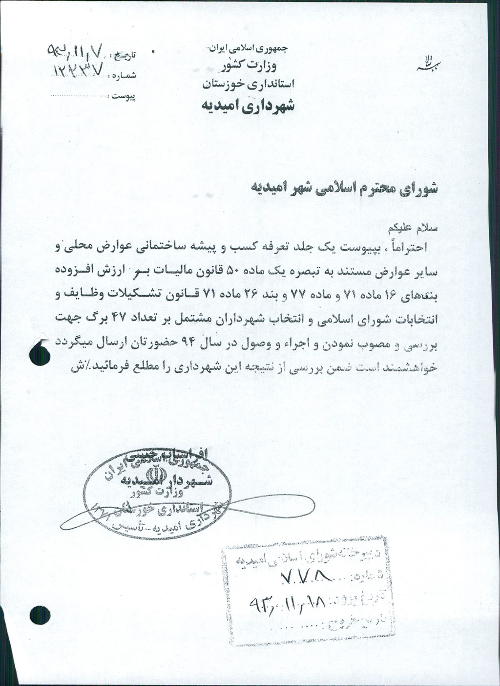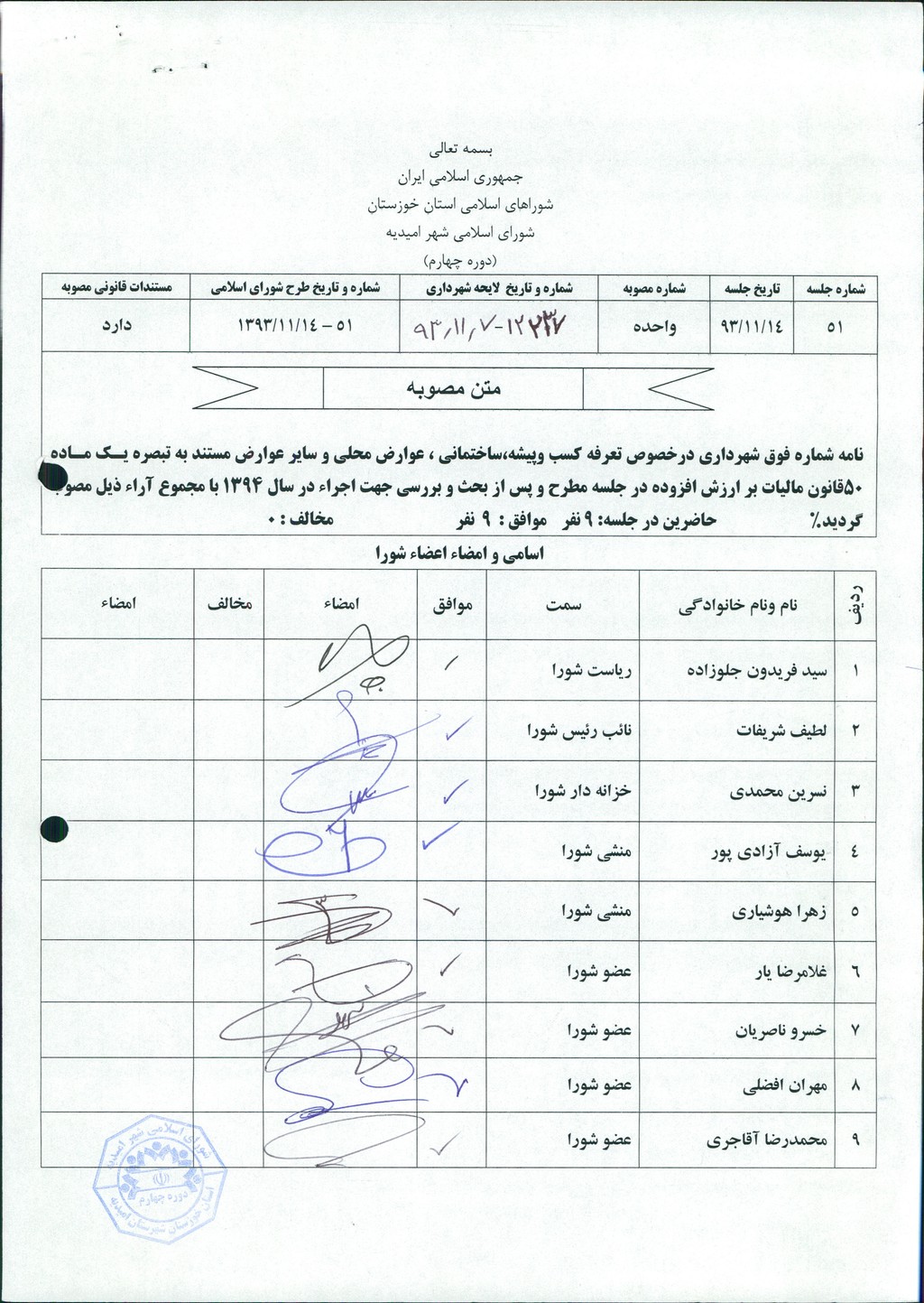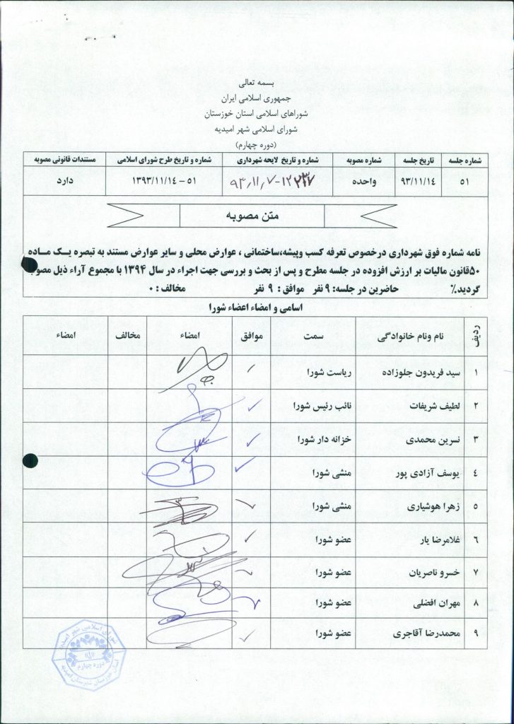 مصوبه شماره ۱ جلسه شماره ۵۱ شورای اسلامی شهر امیدیه