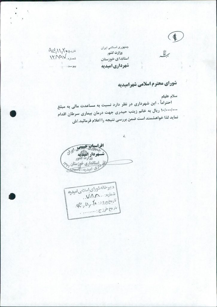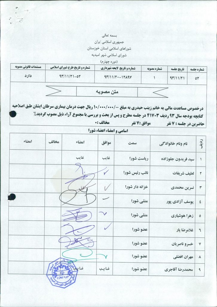 درخصوص مساعدت مالی به خانم زینب حیدری به مبلغ ۱۰۰۰۰۰۰۰ ریال جهت درمان بیماری سرطان ایشان طبق اصلاحیه کتابچه بودجه سال ۹۳ ردیف ۴۱۷۰۳ در جلسه مطرح و پس از بحث و بررسی با مجموع آراء ذیل مصوب گردید%