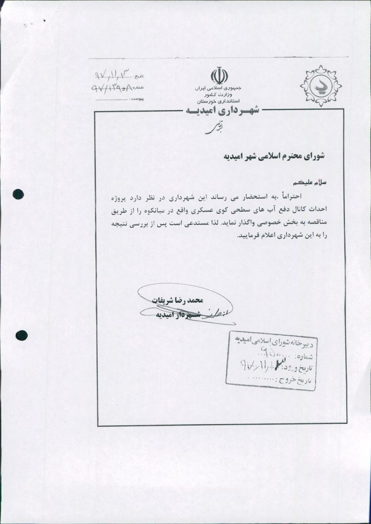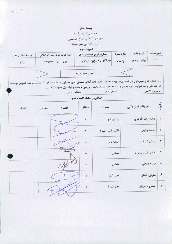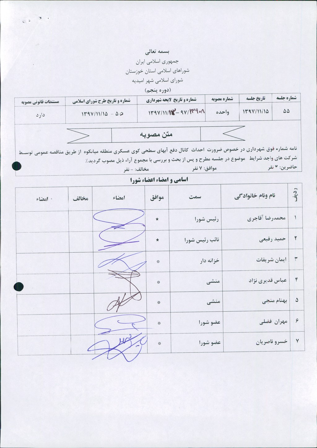 مصوبه شماره ۱ جلسه شماره ۵۵ شورای اسلامی شهر امیدیه