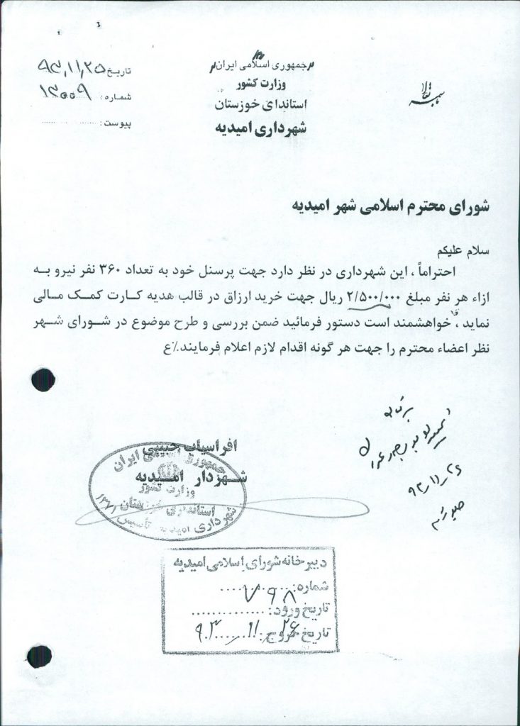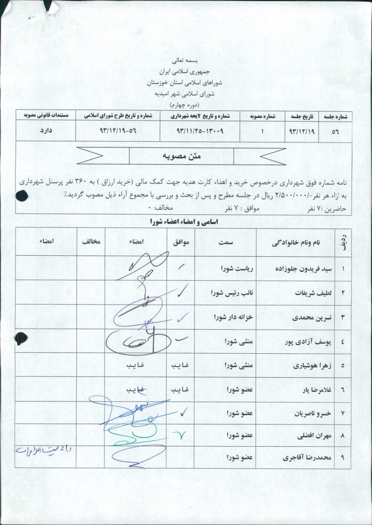 مصوبه شماره ۱ جلسه شماره ۵۶ شورای اسلامی شهر امیدیه