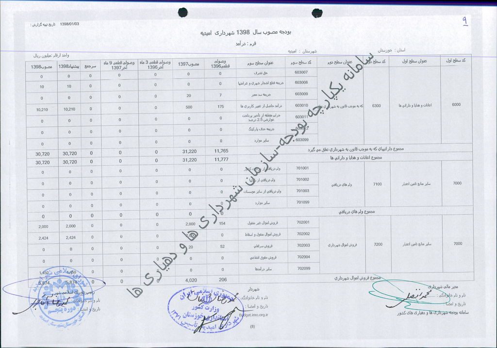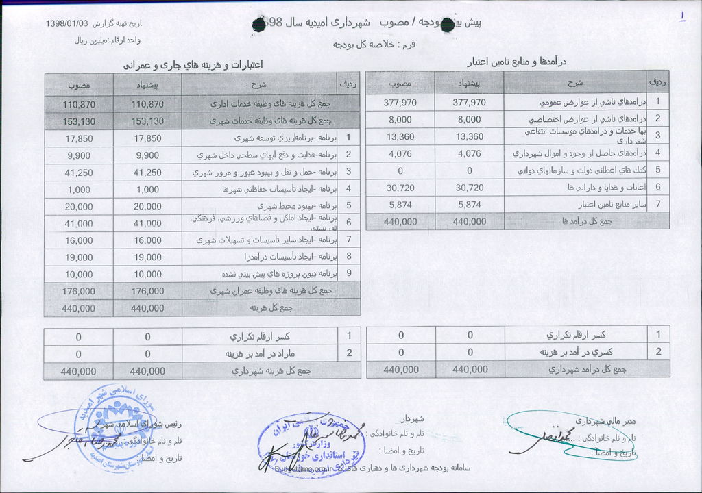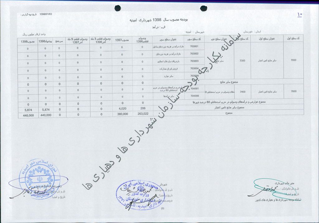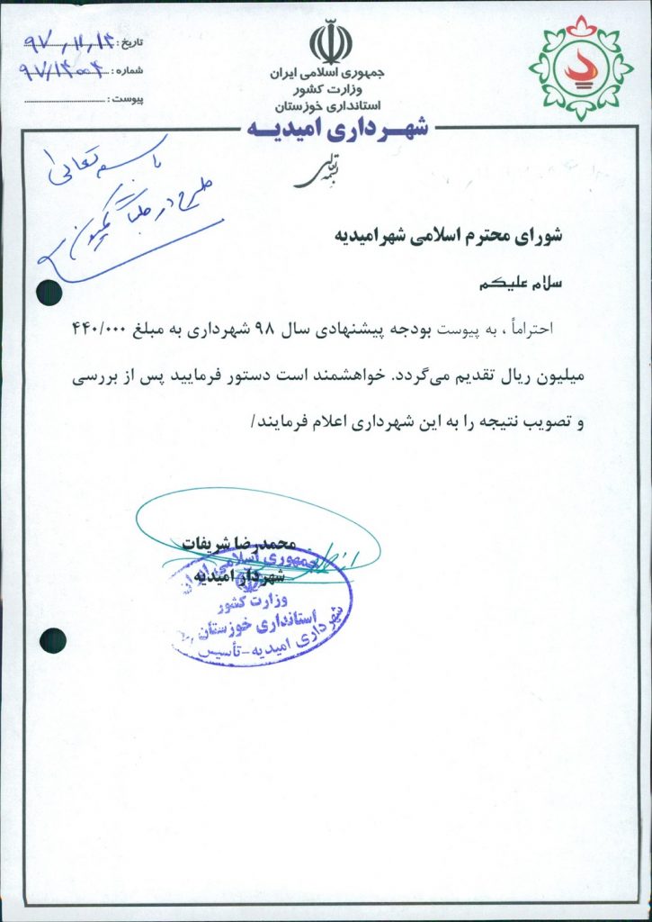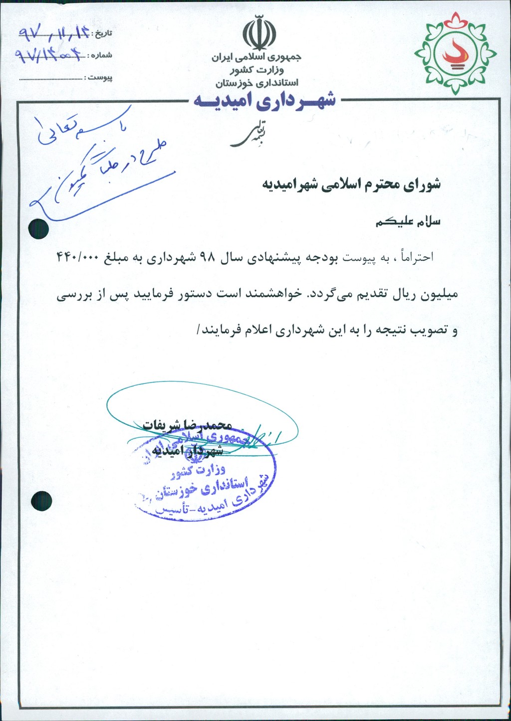 نامه شماره فوق شهرداری در خصوص بودجه پیشنهادی سال۹۸ شهرداری امیدیه به مبلغ۴۴۰۰۰۰۰۰۰۰۰۰ريال در جلسه مطرح و پس از بحث و بررسی با مجموع آراء ذیل مصوب گردید%