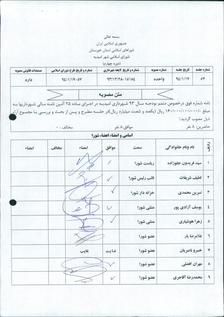 مصوبه شماره ۱ جلسه شماره ۵۷ شورای اسلامی شهر امیدیه