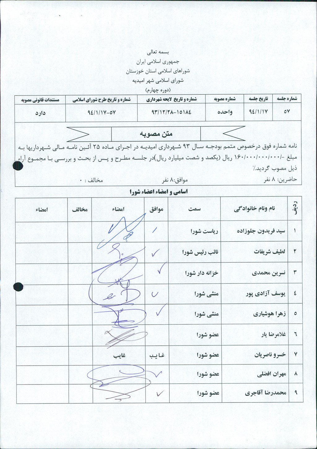 نامه شماره فوق درخصوص متمم بودجه سال ۹۳ شهرداری امیدیه در اجرای ماده ۲۵ آئین نامه مالی شهرداریها به مبلغ ۱۶۰۰۰۰۰۰۰۰۰۰ ریال (یکصد و شصت میلیارد ریال(در جلسه مطرح و پس از بحث و بررسی با مجموع آراء ذیل مصوب گردید%