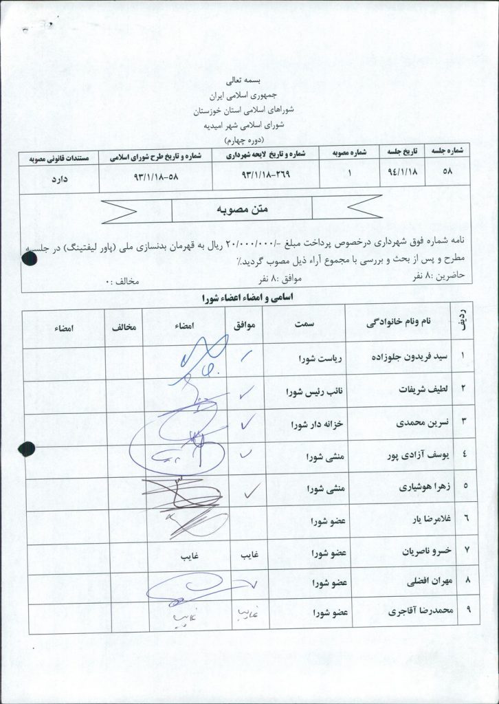 مصوبه شماره ۱ جلسه شماره ۵۸ شورای اسلامی شهر امیدیه