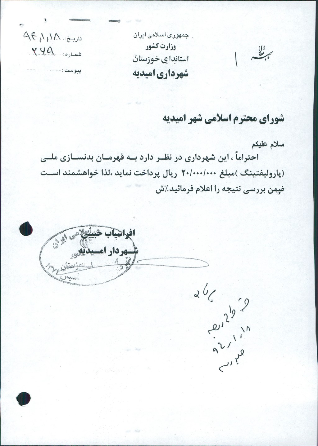 نامه شماره فوق شهرداری درخصوص پرداخت مبلغ ۲۰۰۰۰۰۰۰ ریال به قهرمان بدنسازی ملی (پاور لیفتینگ) در جلسه مطرح و پس از بحث و بررسی با مجموع آراء ذیل مصوب گردید%