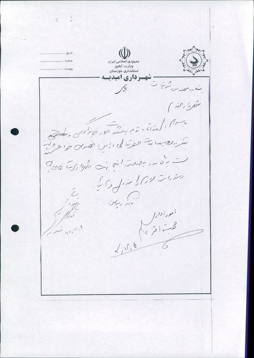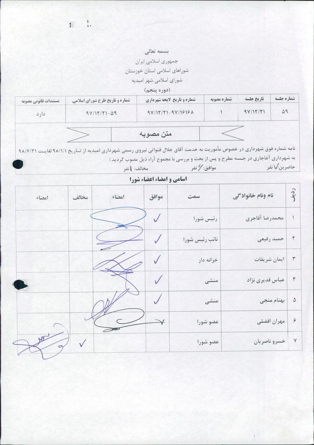 مصوبه شماره ۱ جلسه شماره۵۹ شورای اسلامی شهر امیدیه
