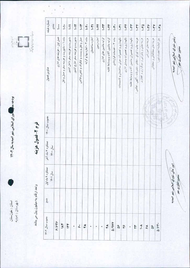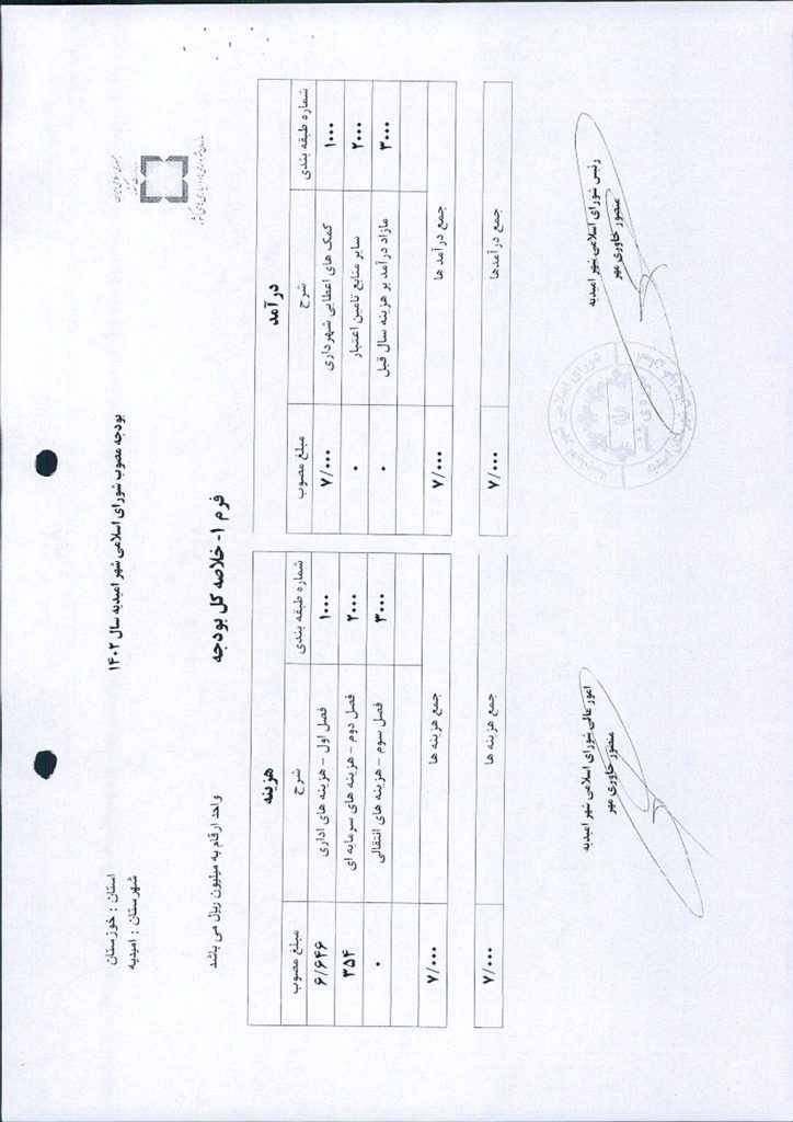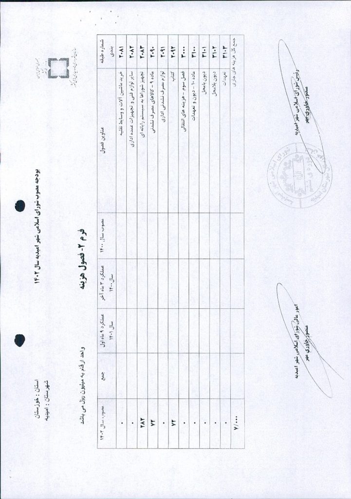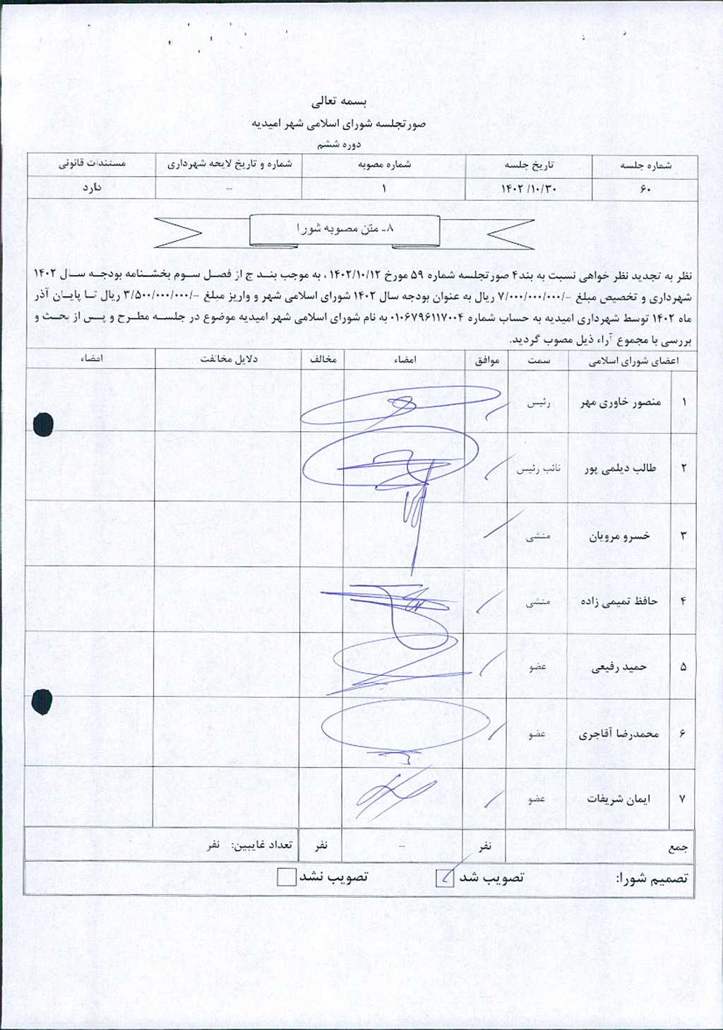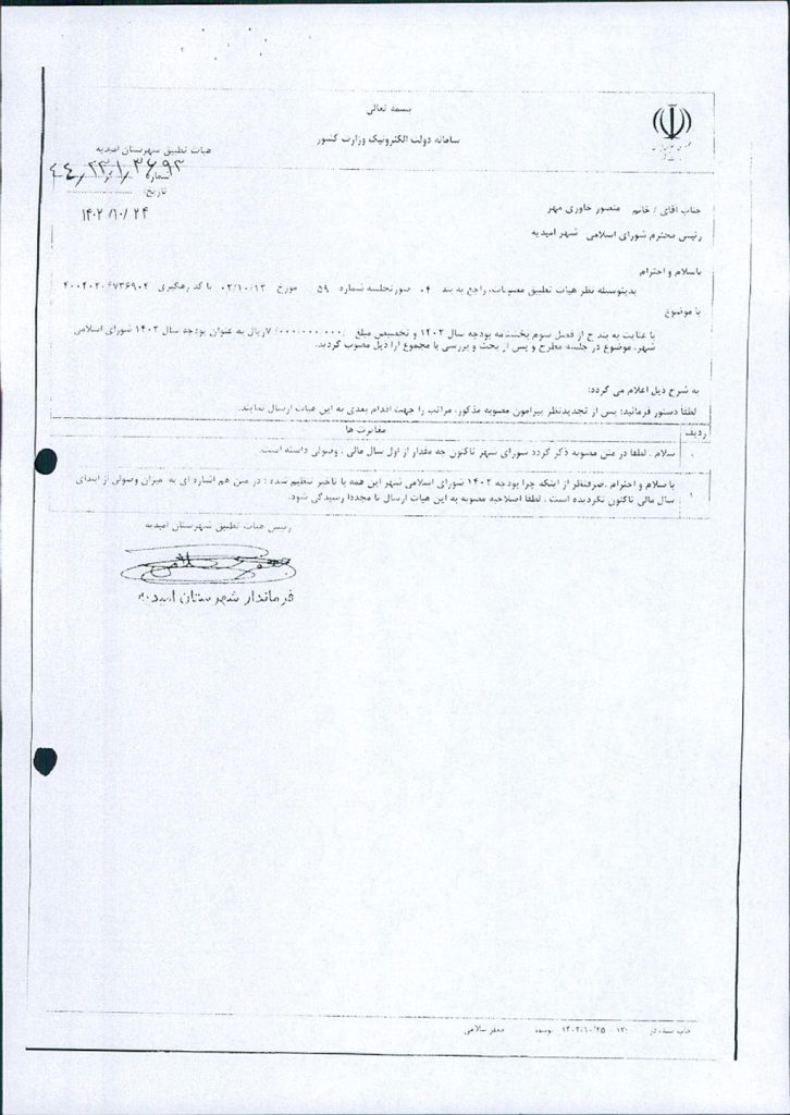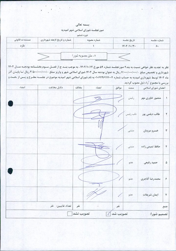 نظر به تجدید نظر خواهی نسبت به بند۴ صورتجلسه شماره ۵۹ مورخ ۱۲/ ۱۰/ ۱۴۰۲ ، به موجب بند ج از فصل سوم بخشنامه بودجه سال ۱۴۰۲ شهرداری و تخصیص مبلغ -/۰۰۰/۰۰۰/۰۰۰/ ۷ ریال به عنوان بودجه سال ۱۴۰۲ شورای اسلامی شهر و واریز مبلغ -/۰۰۰/۰۰۰/ ۵۰۰/ ۳ ریال تا پایان آذر ماه ۱۴۰۲ توسط شهرداری امیدیه به حساب شماره ۰۱۰۶۷۹۶۱۱۷۰۰۴ به نام شورای اسلامی شهر امیدیه موضوع در جلسه مطرح و پس از بحث و بررسی با مجموع آراء ذيل مصوب گرديد.