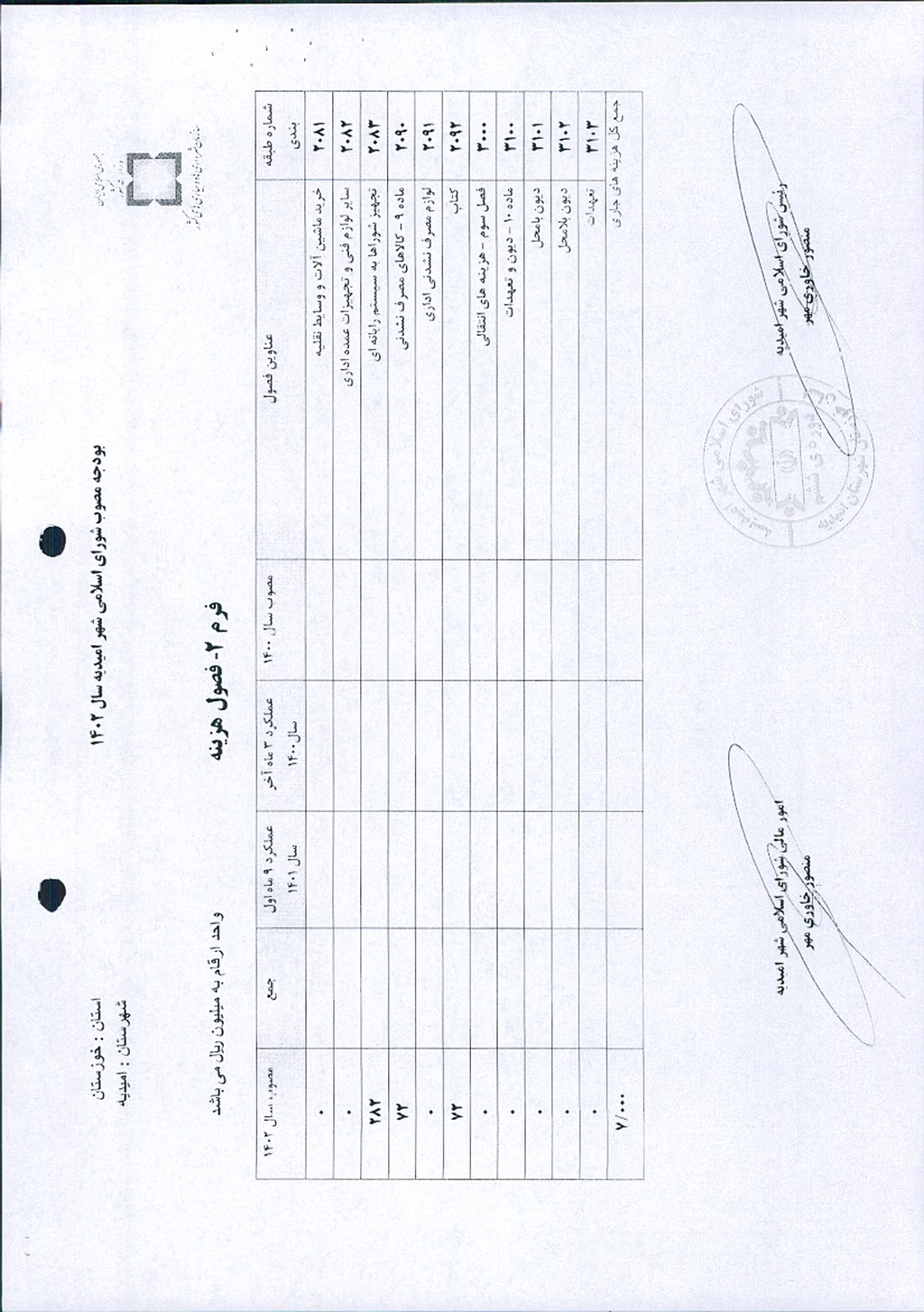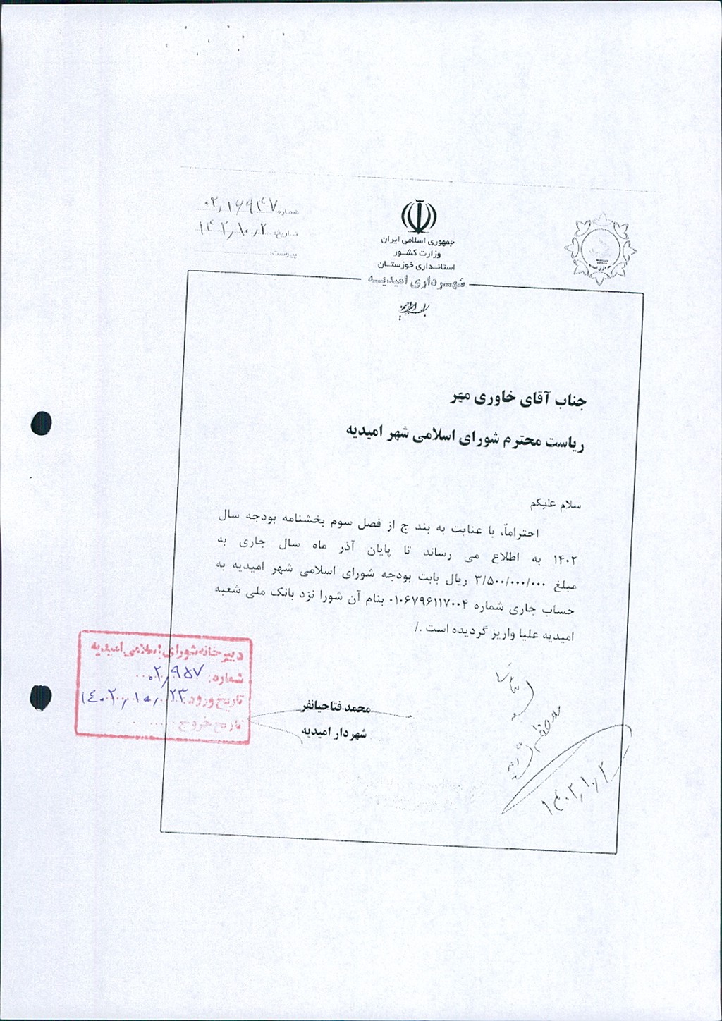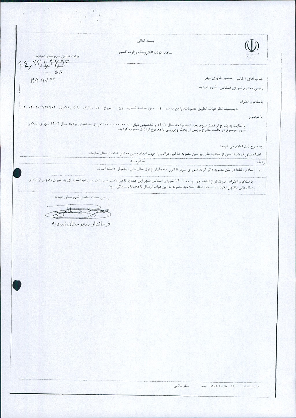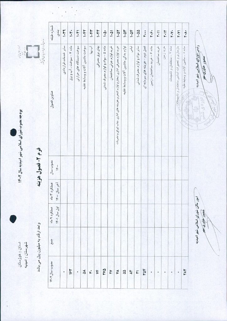 نظر به تجدید نظر خواهی نسبت به بند۴ صورتجلسه شماره ۵۹ مورخ ۱۲/ ۱۰/ ۱۴۰۲ ، به موجب بند ج از فصل سوم بخشنامه بودجه سال ۱۴۰۲ شهرداری و تخصیص مبلغ -/۰۰۰/۰۰۰/۰۰۰/ ۷ ریال به عنوان بودجه سال ۱۴۰۲ شورای اسلامی شهر و واریز مبلغ -/۰۰۰/۰۰۰/ ۵۰۰/ ۳ ریال تا پایان آذر ماه ۱۴۰۲ توسط شهرداری امیدیه به حساب شماره ۰۱۰۶۷۹۶۱۱۷۰۰۴ به نام شورای اسلامی شهر امیدیه موضوع در جلسه مطرح و پس از بحث و بررسی با مجموع آراء ذيل مصوب گرديد.