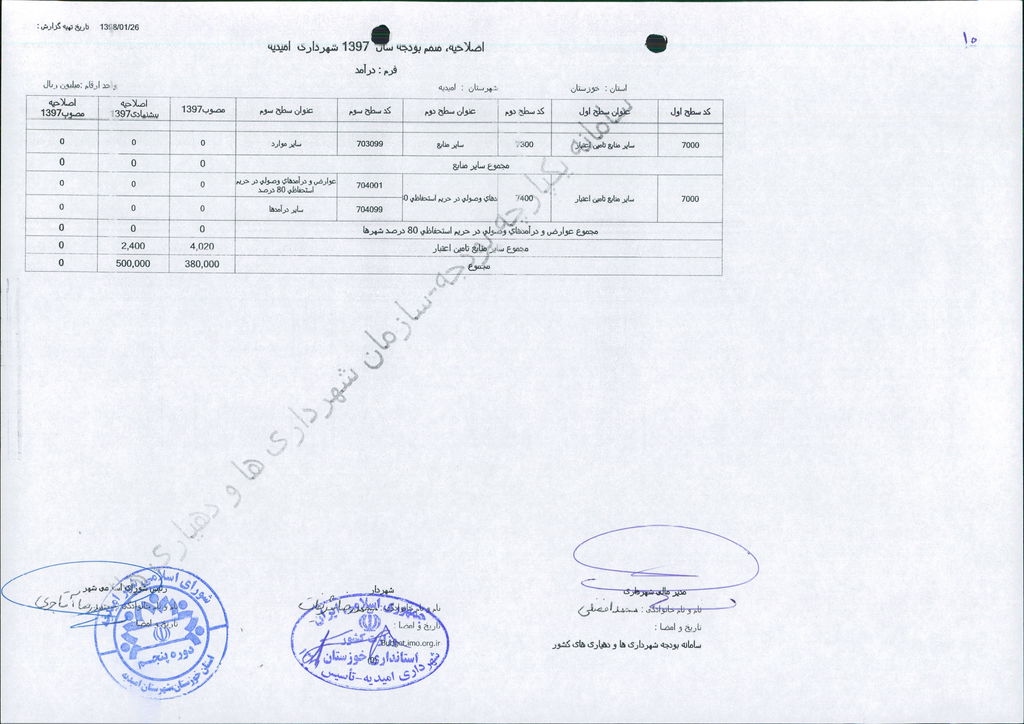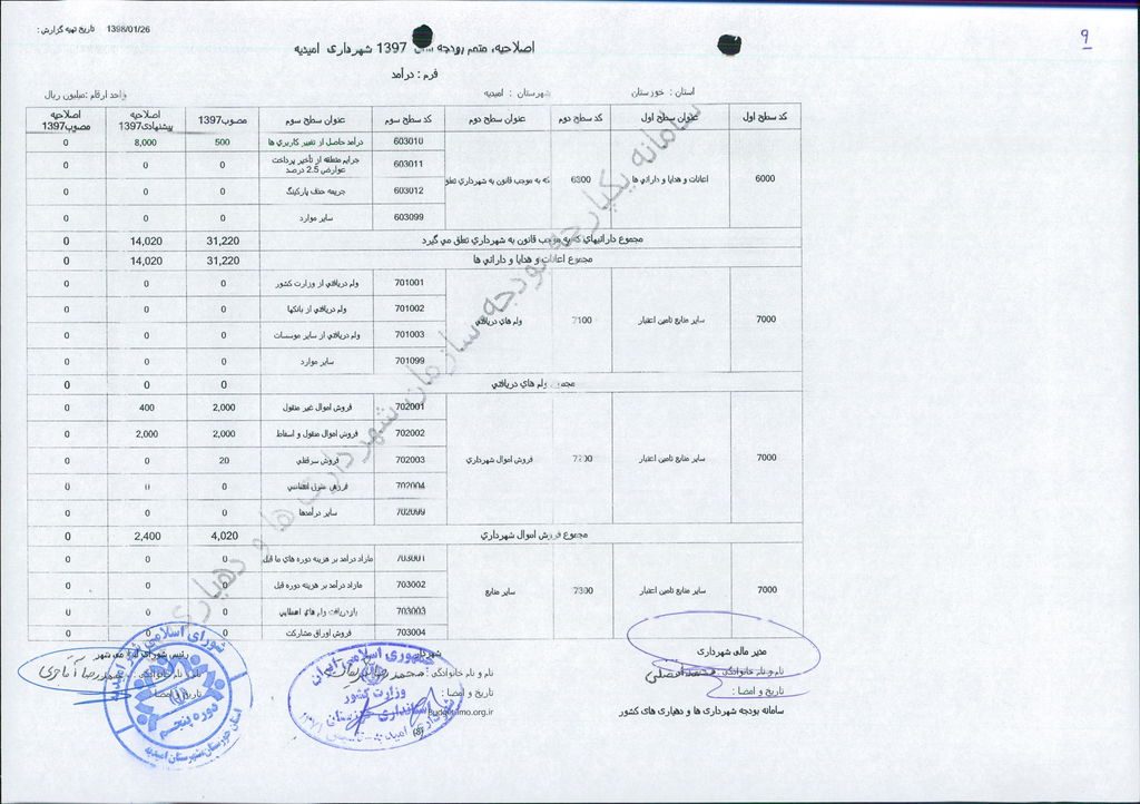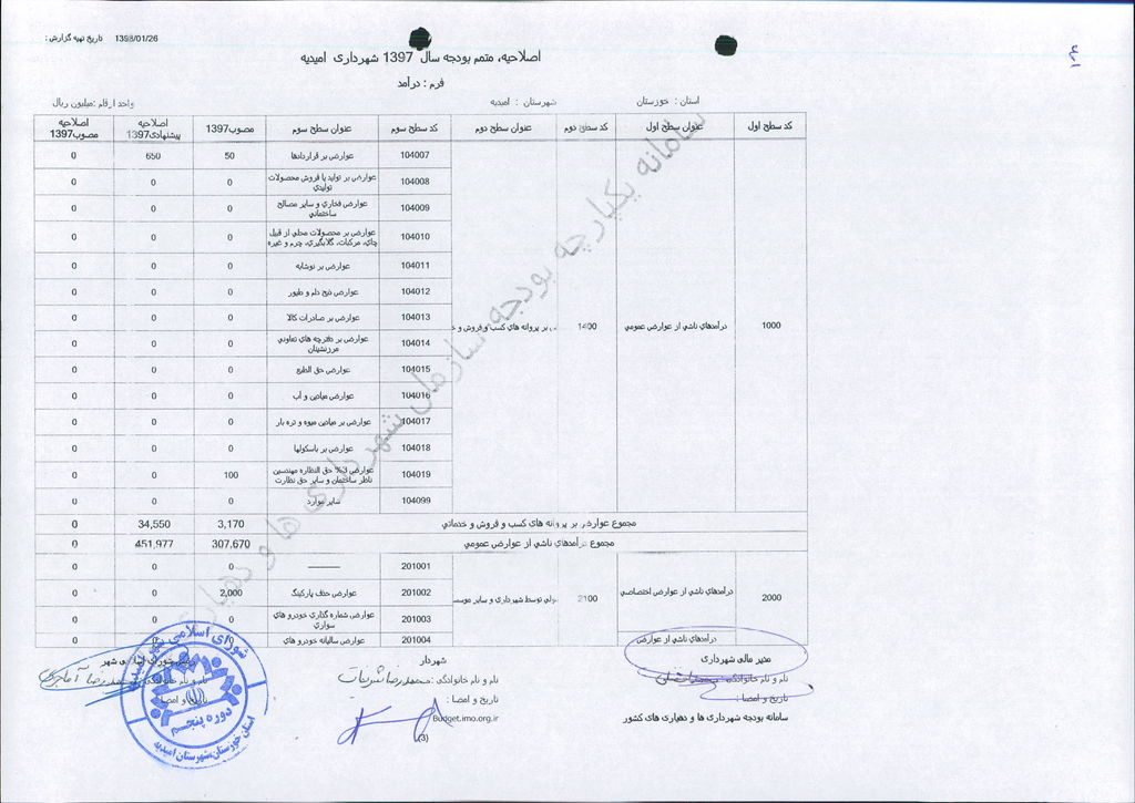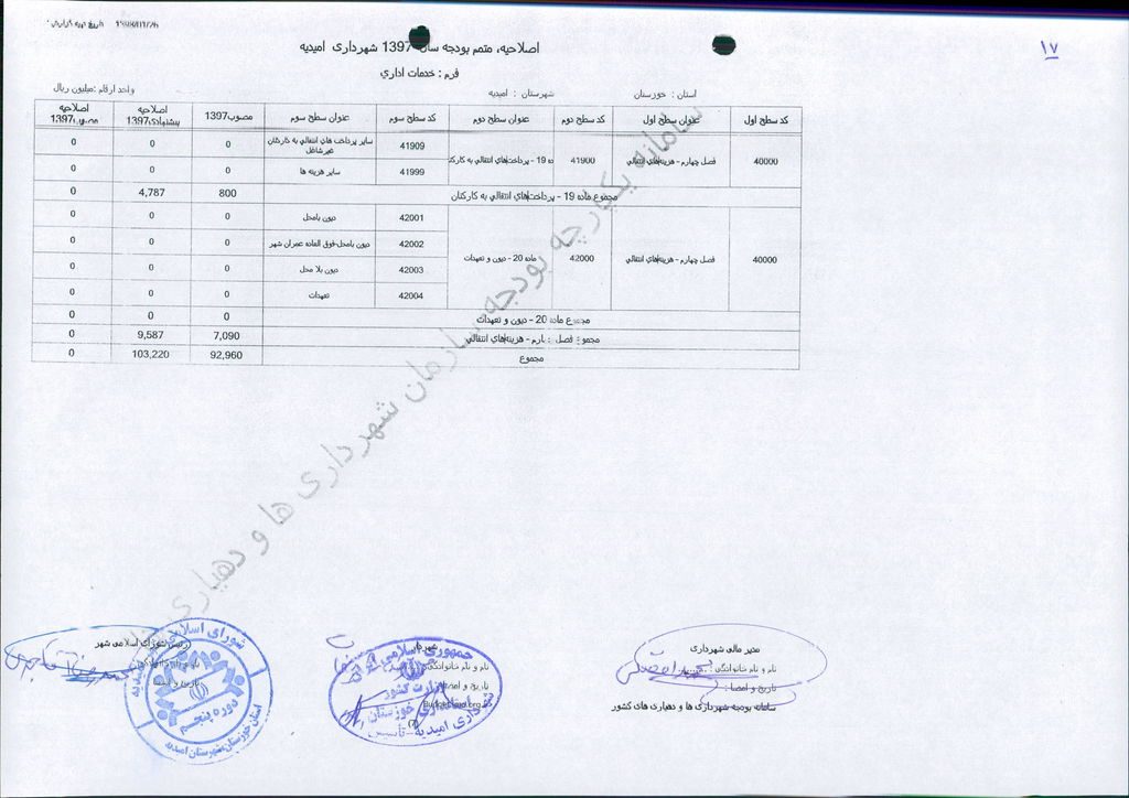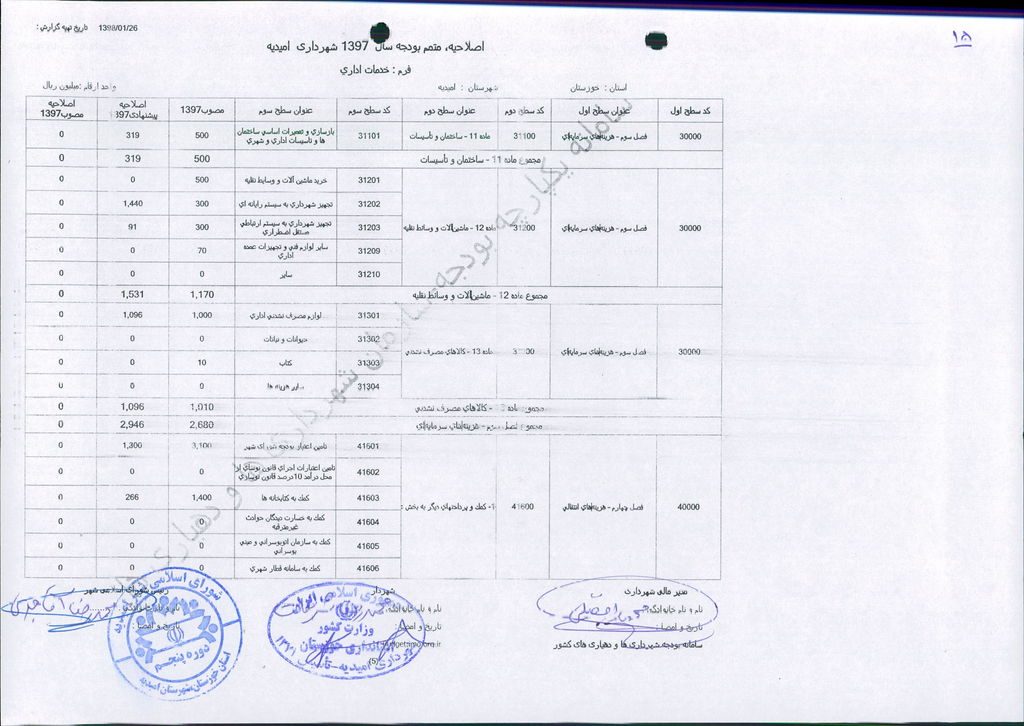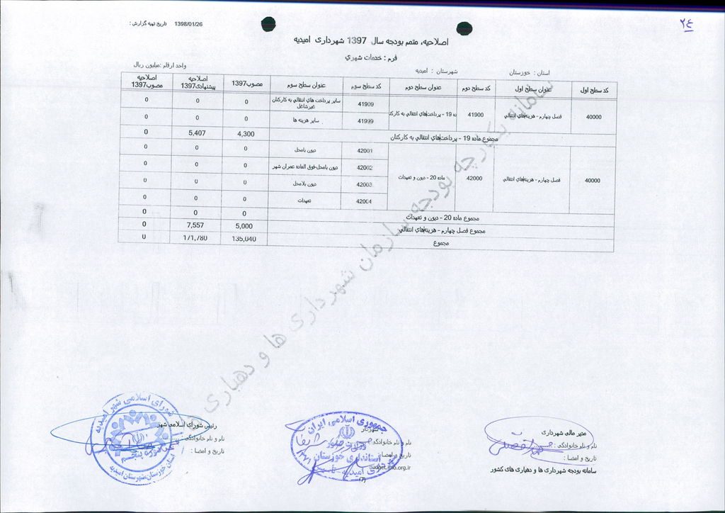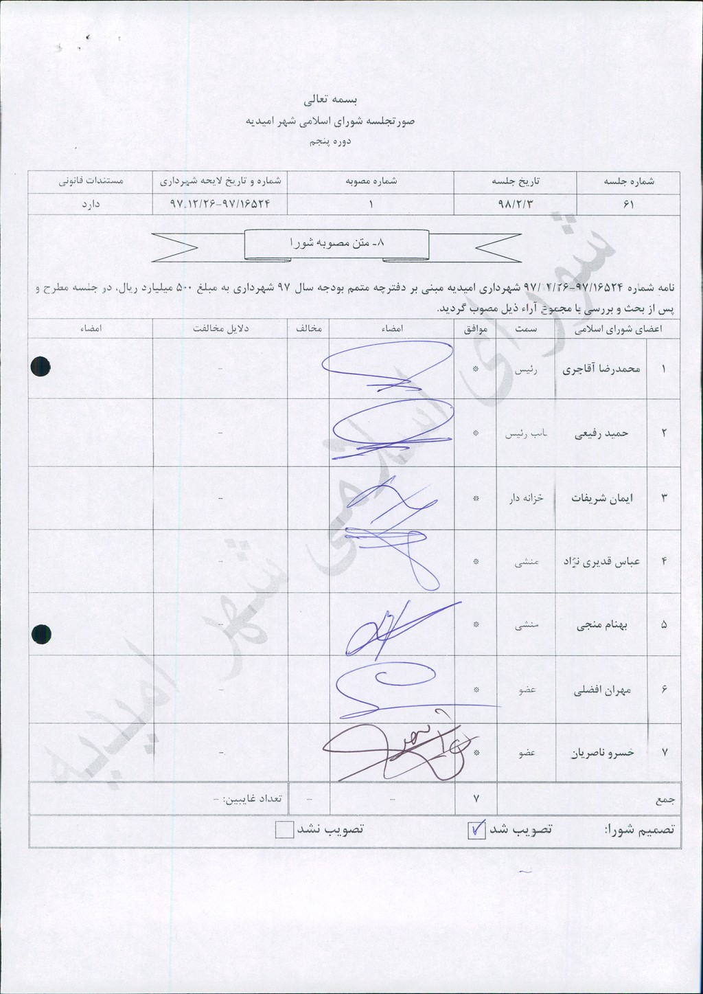 نامه شماره ۱۶۵۲۴/۹۷-۲۶/۱۲/۹۷ شهرداری امیدیه مبنی بر دفترچه متمم بودجه سال ۹۷ شهرداری به مبلغ ۵۰۰ میلیارد ریال، در جلسه مطرح و پس از بحث و بررسی با مجموع آراء ذیل مصوب گردید.