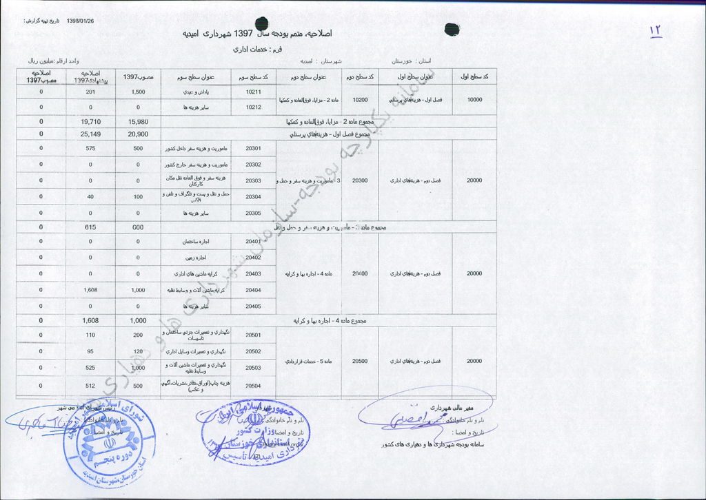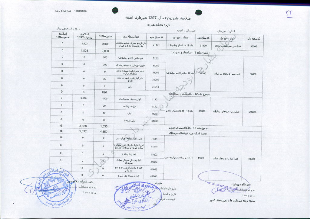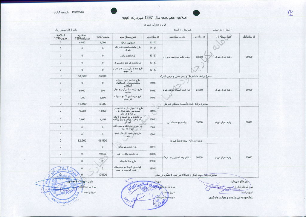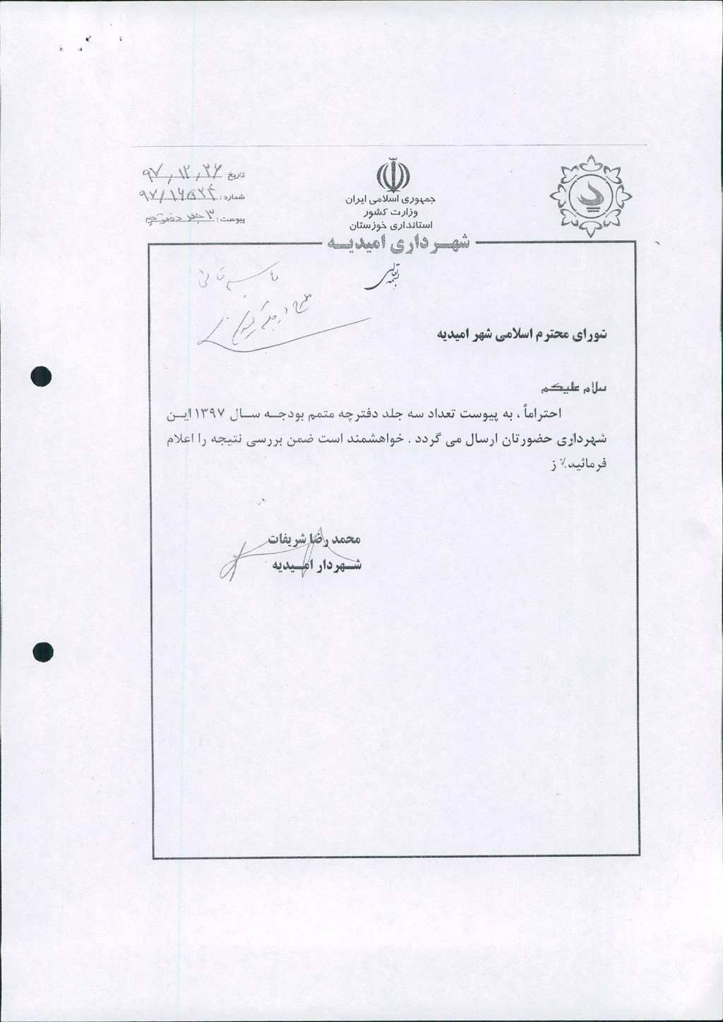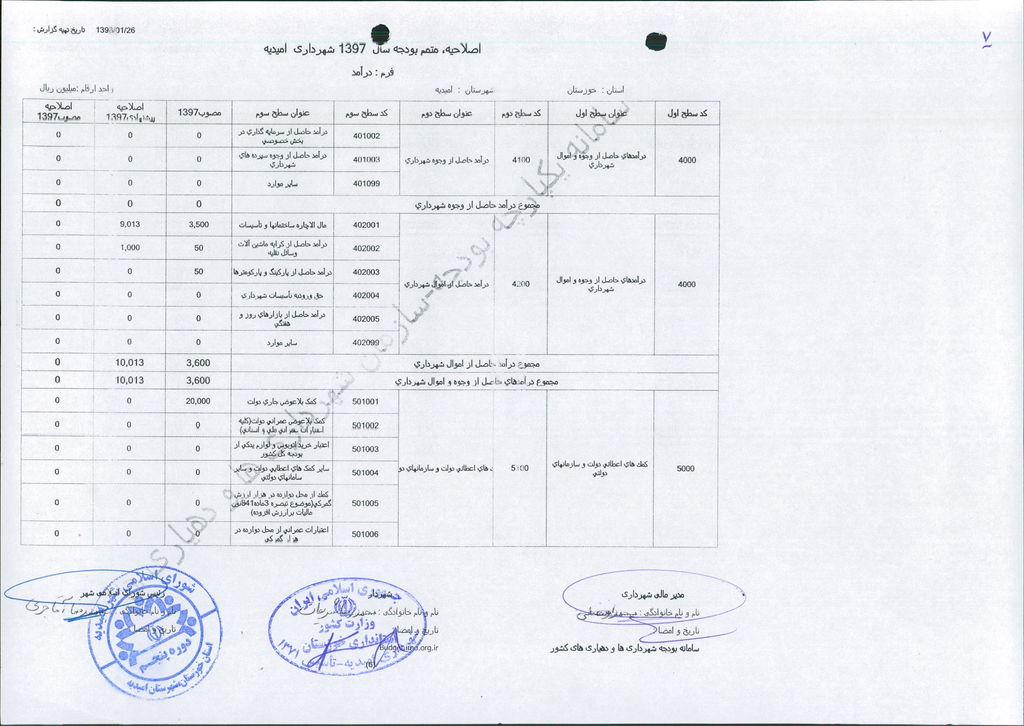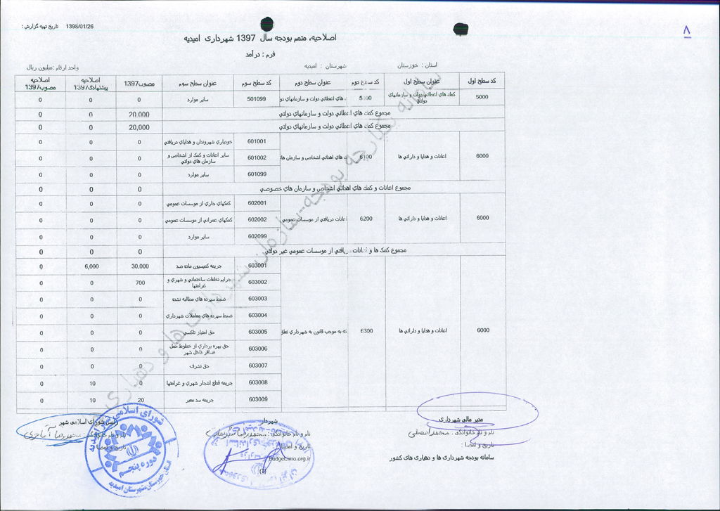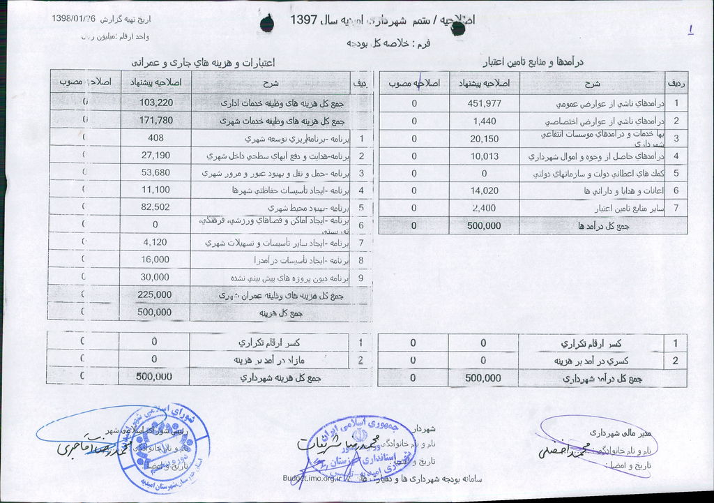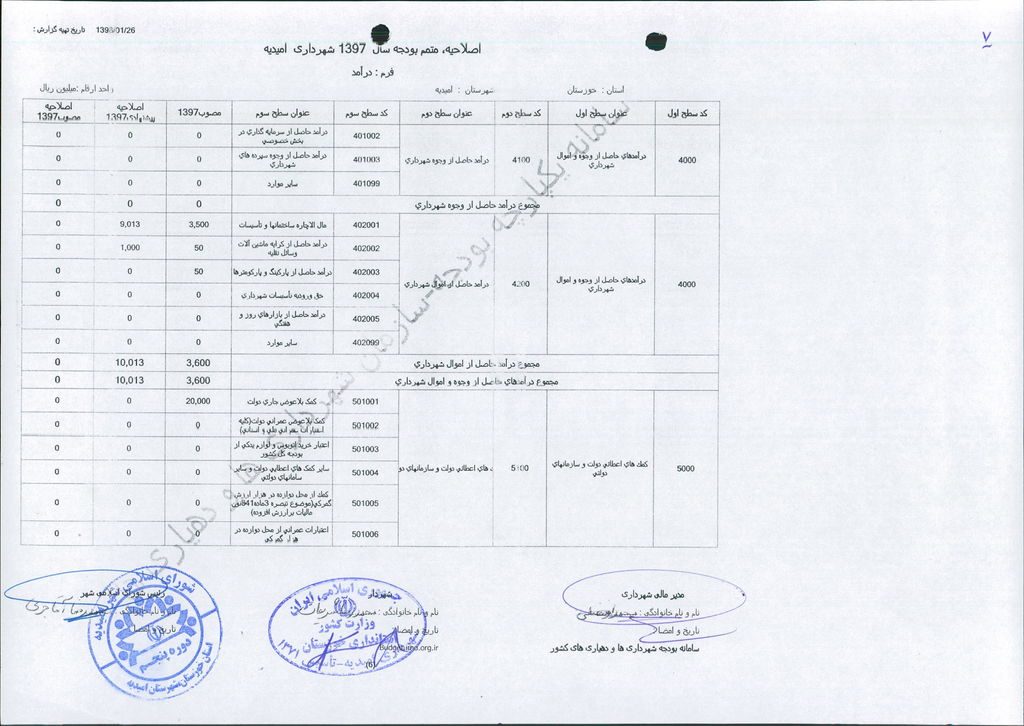 نامه شماره ۱۶۵۲۴/۹۷-۲۶/۱۲/۹۷ شهرداری امیدیه مبنی بر دفترچه متمم بودجه سال ۹۷ شهرداری به مبلغ ۵۰۰ میلیارد ریال، در جلسه مطرح و پس از بحث و بررسی با مجموع آراء ذیل مصوب گردید.