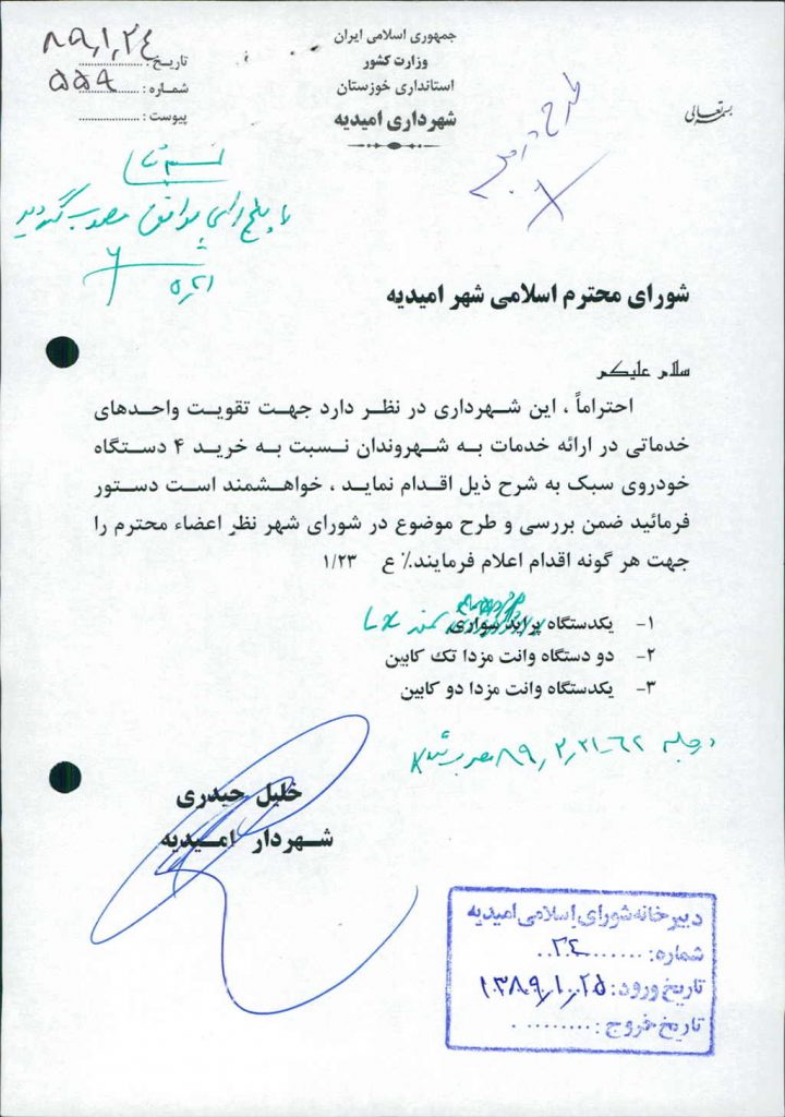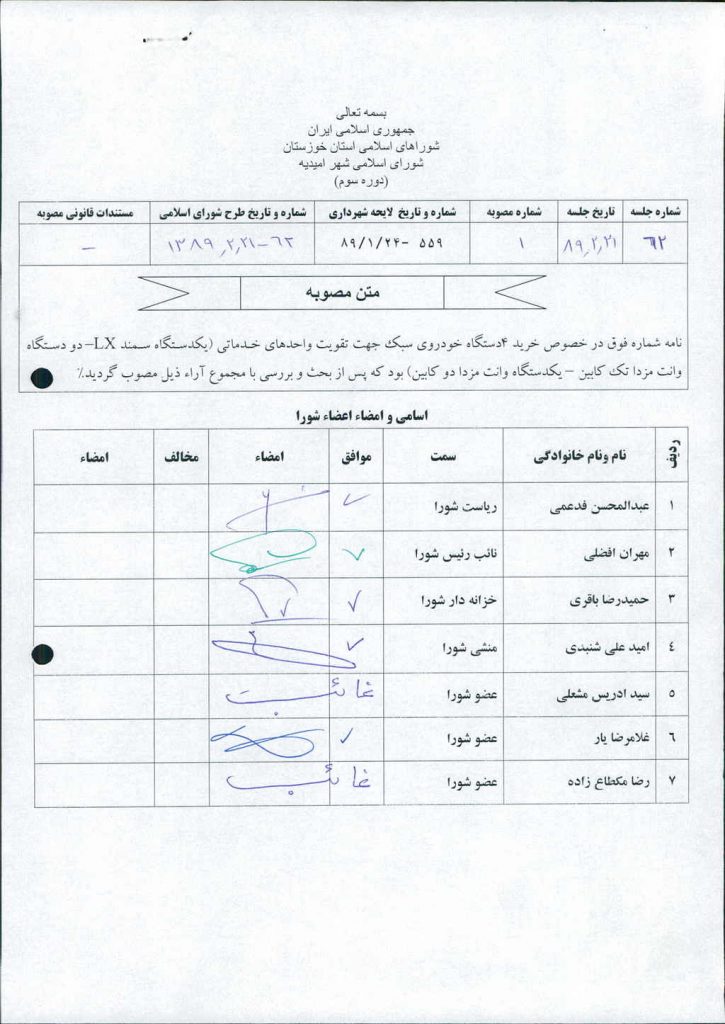 نامه شماره فوق در خصوص خرید ۴دستگاه خودروی سبک جهت تقویت واحدهای خدماتی (یکدستگاه سمند LX– دو دستگاه وانت مزدا تک کابین – یکدستگاه وانت مزدا دو کابین) بود که پس از بحث و بررسی با مجموع آراء ذیل مصوب گردید%
