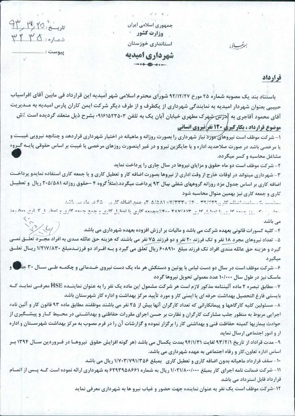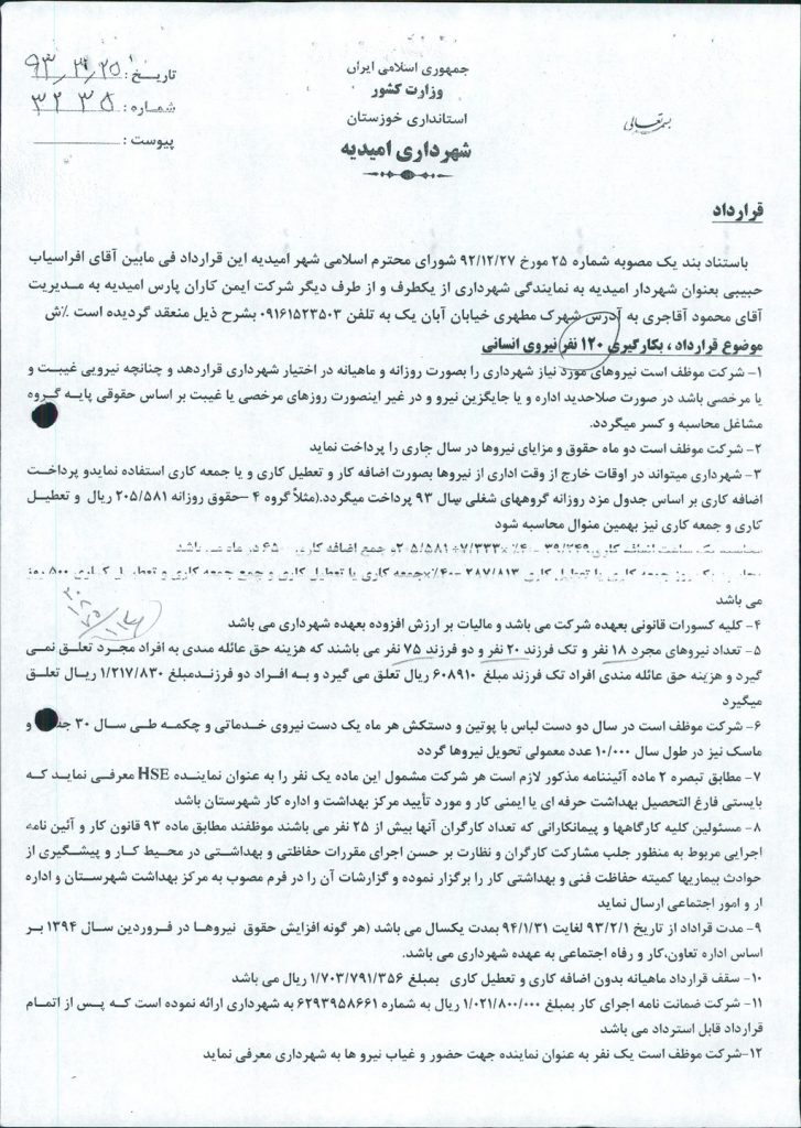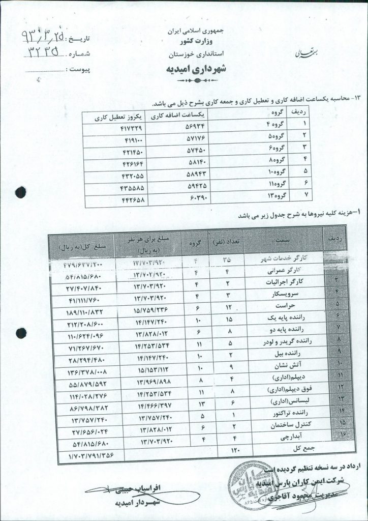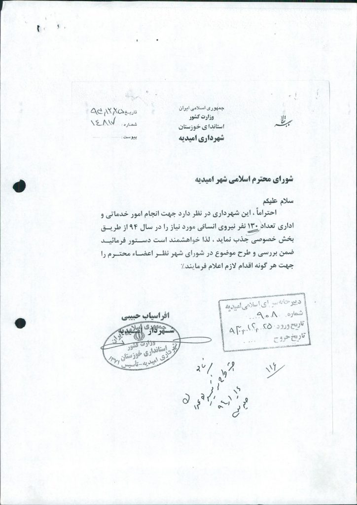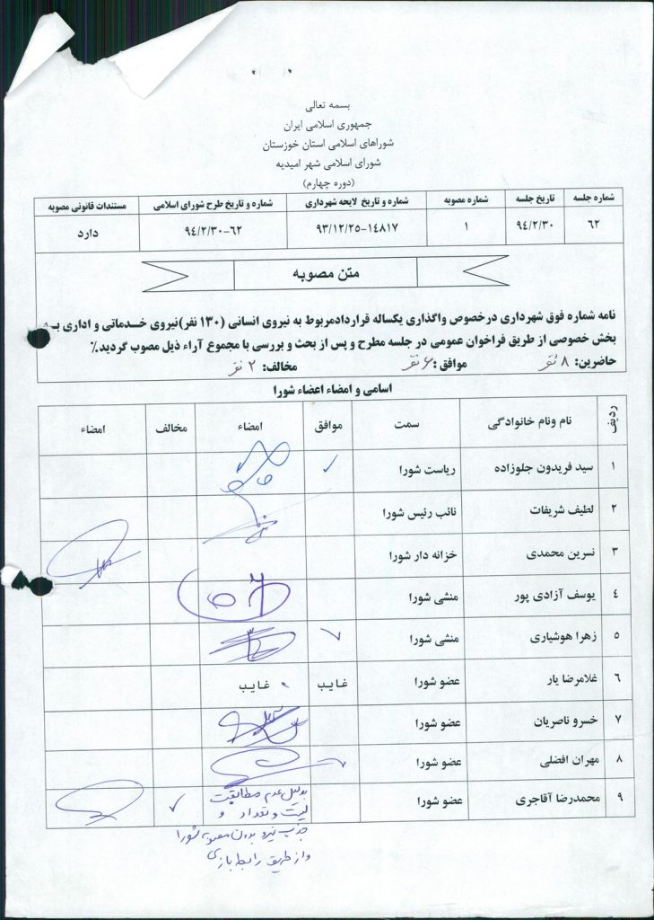 مصوبه شماره ۱ جلسه شماره ۶۲ شورای اسلامی شهر امیدیه