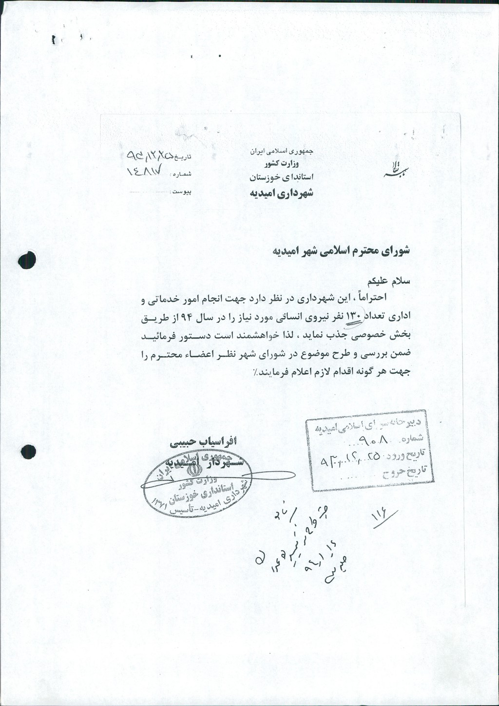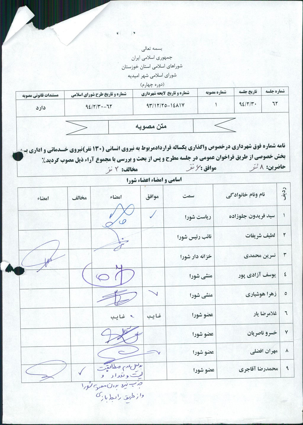 نامه شماره فوق شهرداری درخصوص واگذاری یکساله قراردادمربوط به نیروی انسانی (۱۳۰ نفر)نیروی خدماتی و اداری به بخش خصوصی از طریق فراخوان عمومی در جلسه مطرح و پس از بحث و بررسی با مجموع آراء ذیل مصوب گردید%