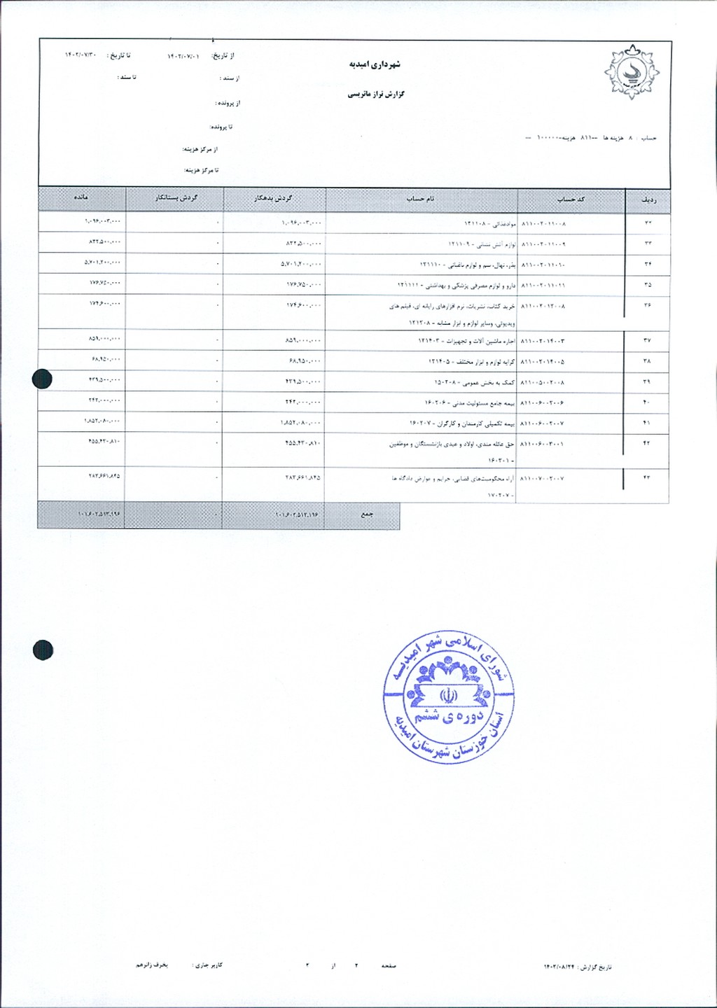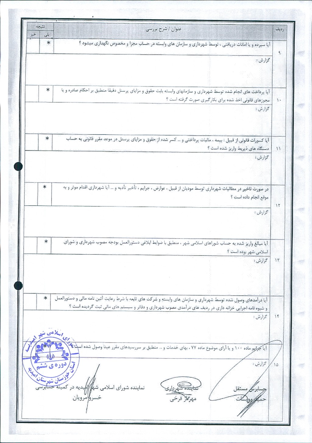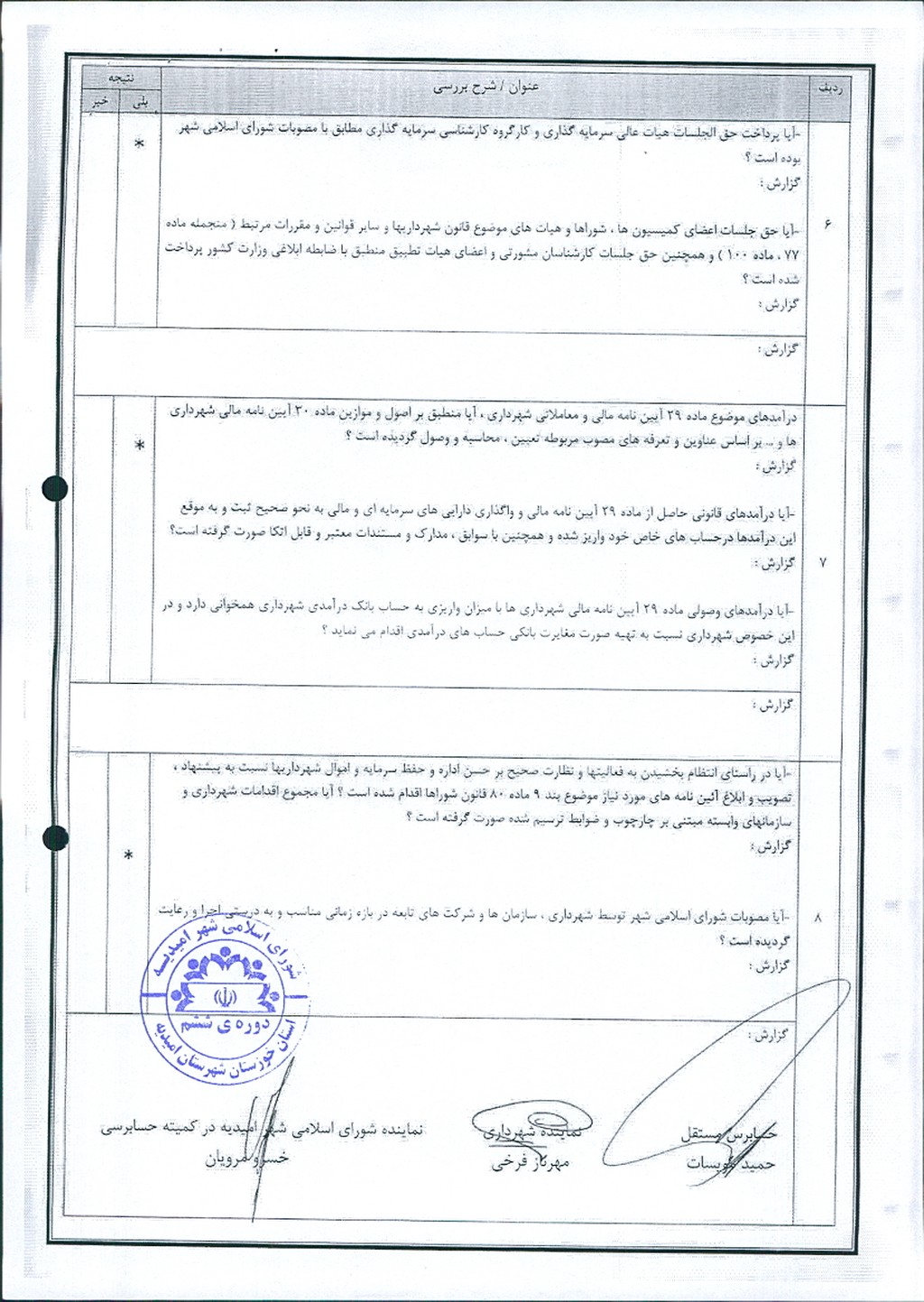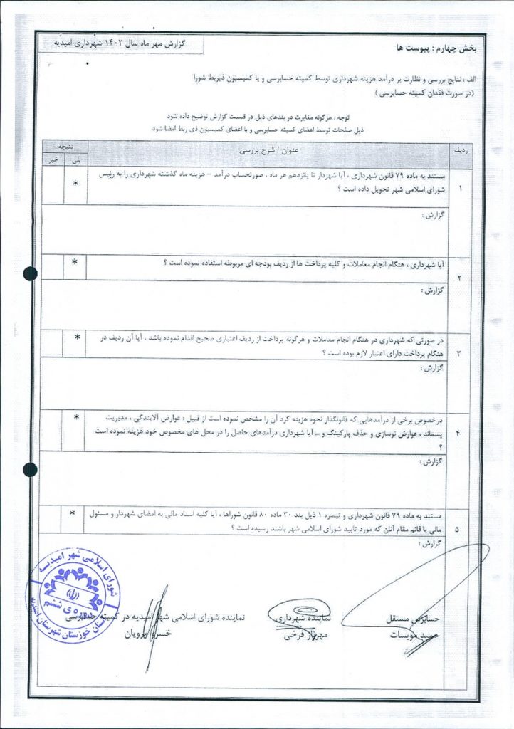 با توجه به ارائه گزارش عملکرد درآمد – هزینه مهرماه سالجاری شهرداری امیدیه توسط کمیته حسابرسی موضوع در جلسه مطرح و پس از بحث و بررسی با مجموع آراء ذیل مصوب گردید.