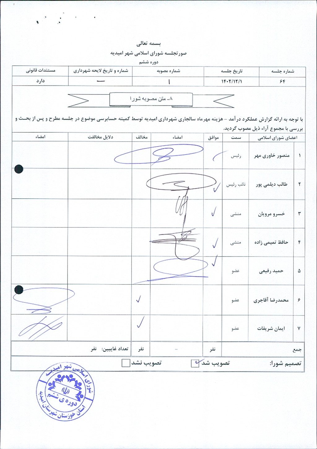 مصوبه شماره ۱ جلسه شماره ۶۴ مورخ ۱۴۰۲/۱۲/۱ شورای اسلامی شهر امیدیه