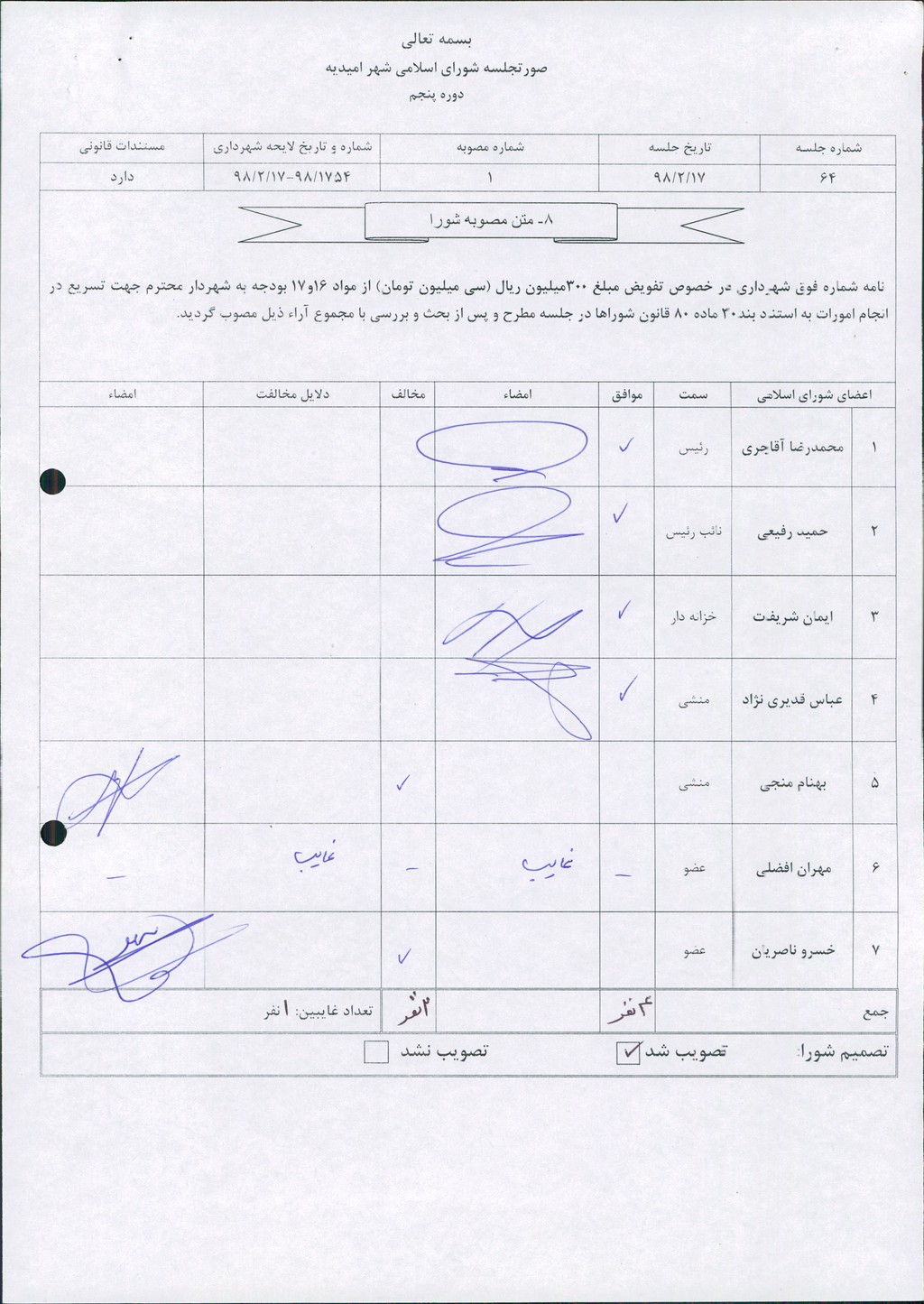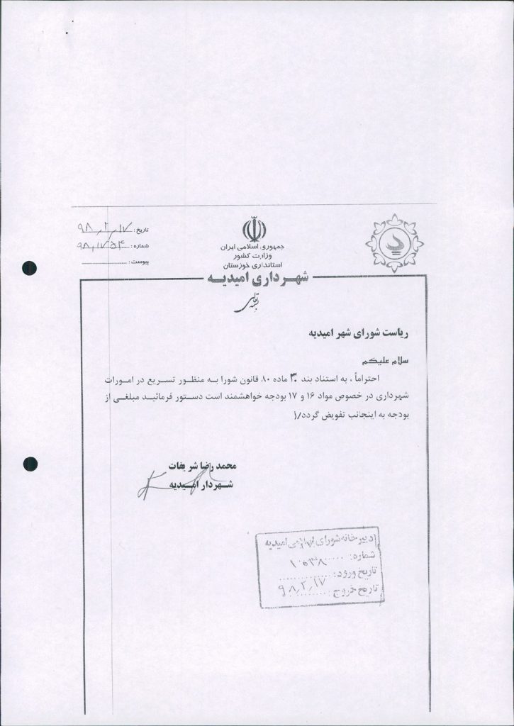 مصوبه شماره ۱ جلسه شماره ۶۴ شورای اسلامی شهر امیدیه