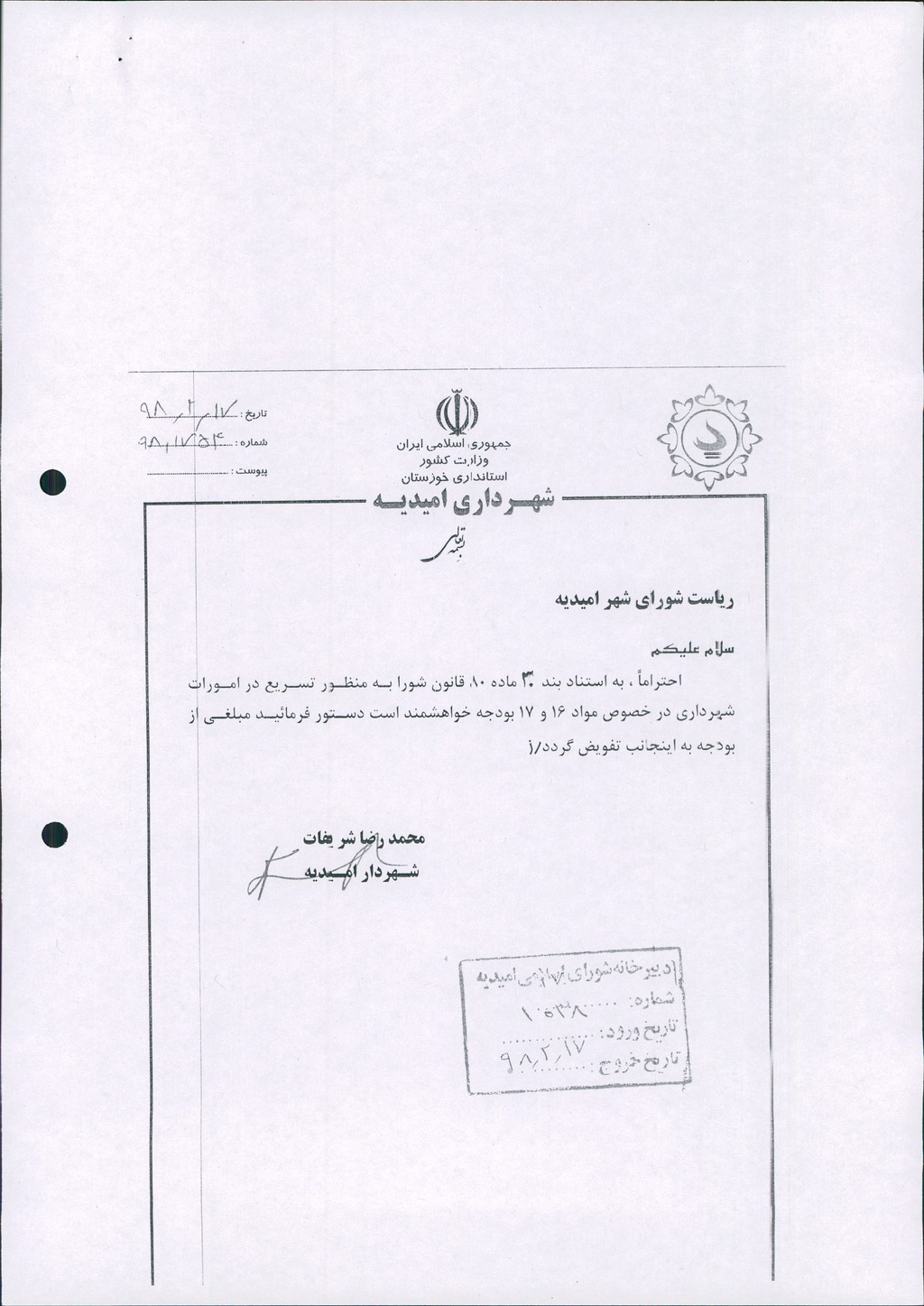 نامه شماره فوق شهرداری در خصوص تفویض مبلغ ۳۰۰میلیون ریال (سی میلیون تومان) از مواد ۱۶و۱۷ بودجه به شهردار محترم جهت تسریع در انجام امورات به استناد بند۳۰ ماده ۸۰ قانون شوراها در جلسه مطرح و پس از بحث و بررسی با مجموع آراء ذیل مصوب گردید.