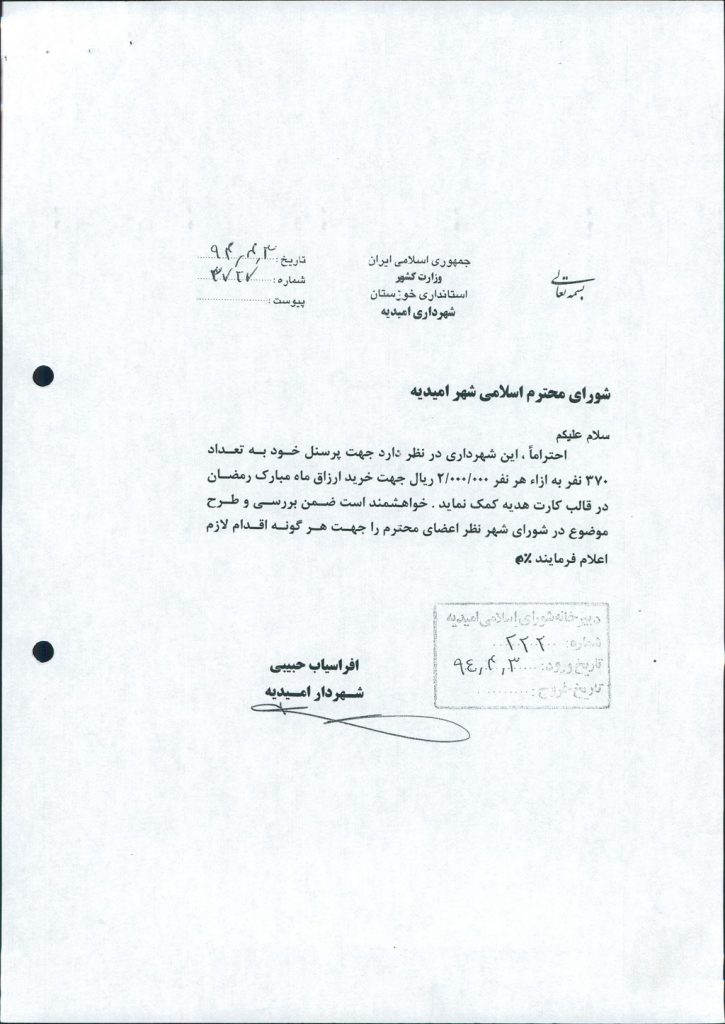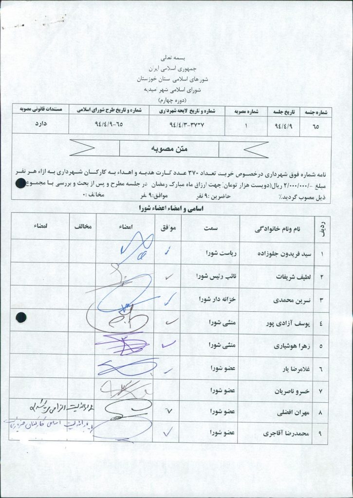مصوبه شماره ۱ جلسه شماره ۶۵ شورای اسلامی شهر امیدیه