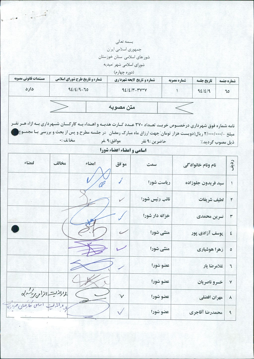 مصوبه شماره ۱ جلسه شماره ۶۵ مورخ ۹۴/۴/۹ شورای اسلامی شهر امیدیه