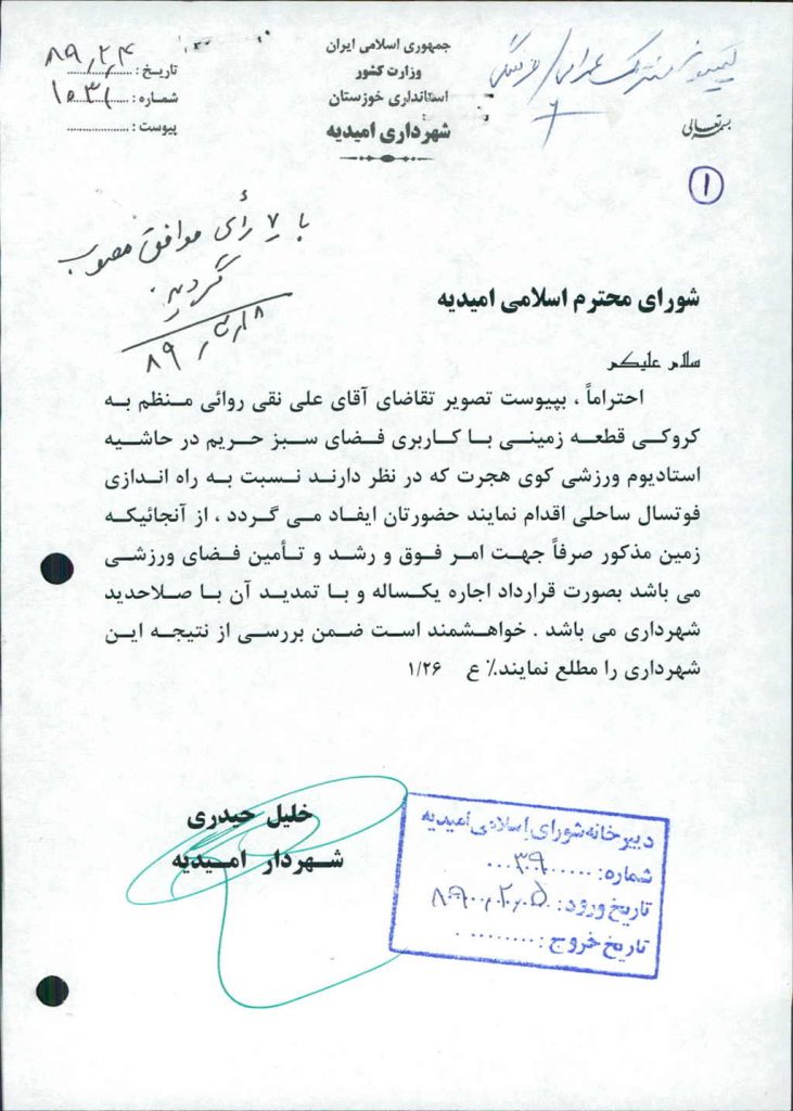 نامه شماره فوق در خصوص تأمین و توسعه فضای ورزشی به درخواست آقای علی نقی روائی مبنی بر راه اندازی مدرسه فوتبال در حاشیه استادیوم ورزشی کوی هجرت مورد بحث و بررسی قرار گرفت و مقرر گردید پس از مصوبه شورا جهت تعیین جزئیات طرح و قرارداد نماینده شهرداری با حضور کمیسیون عمرانی و فرهنگی شورا اقدام به انعقاد قرارداد نماید%