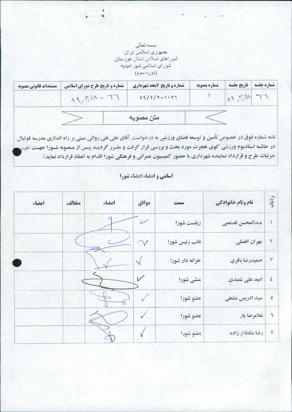 مصوبه شماره ۱ جلسه شماره ۶۶ شورای اسلامی شهر امیدیه