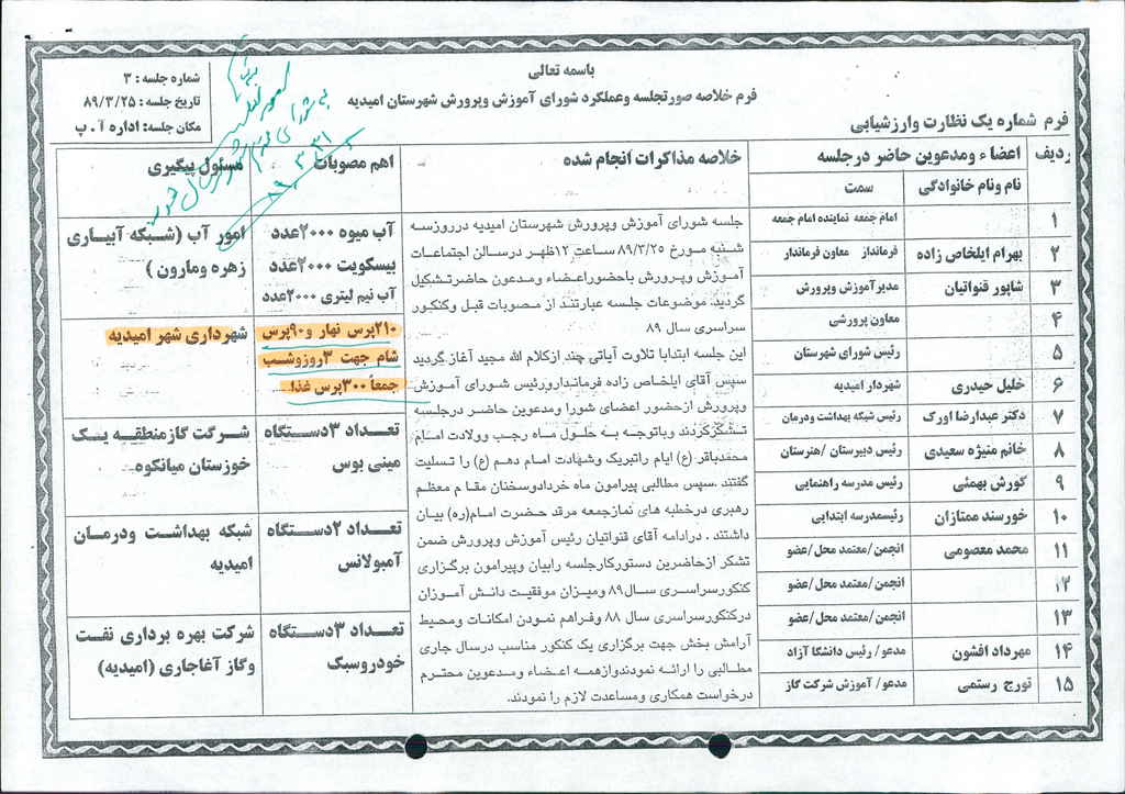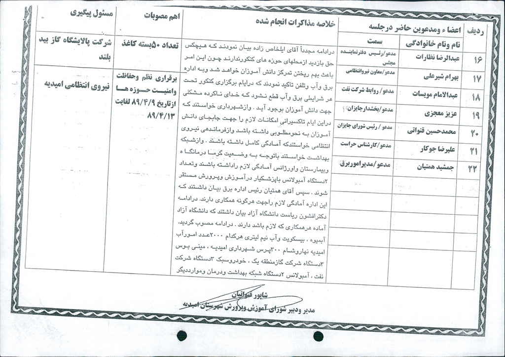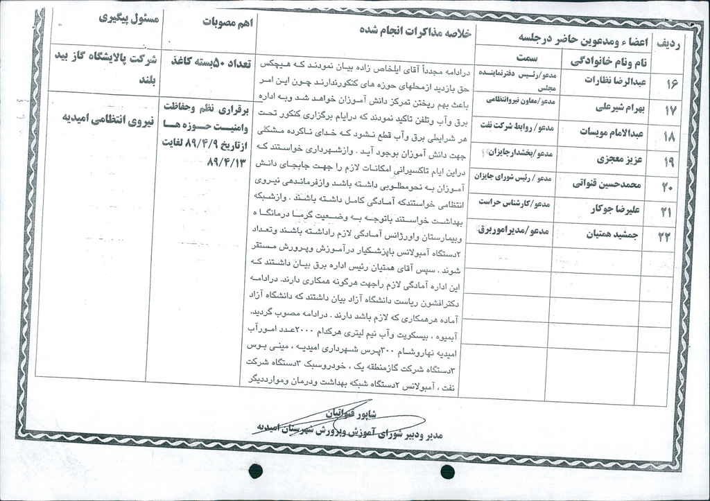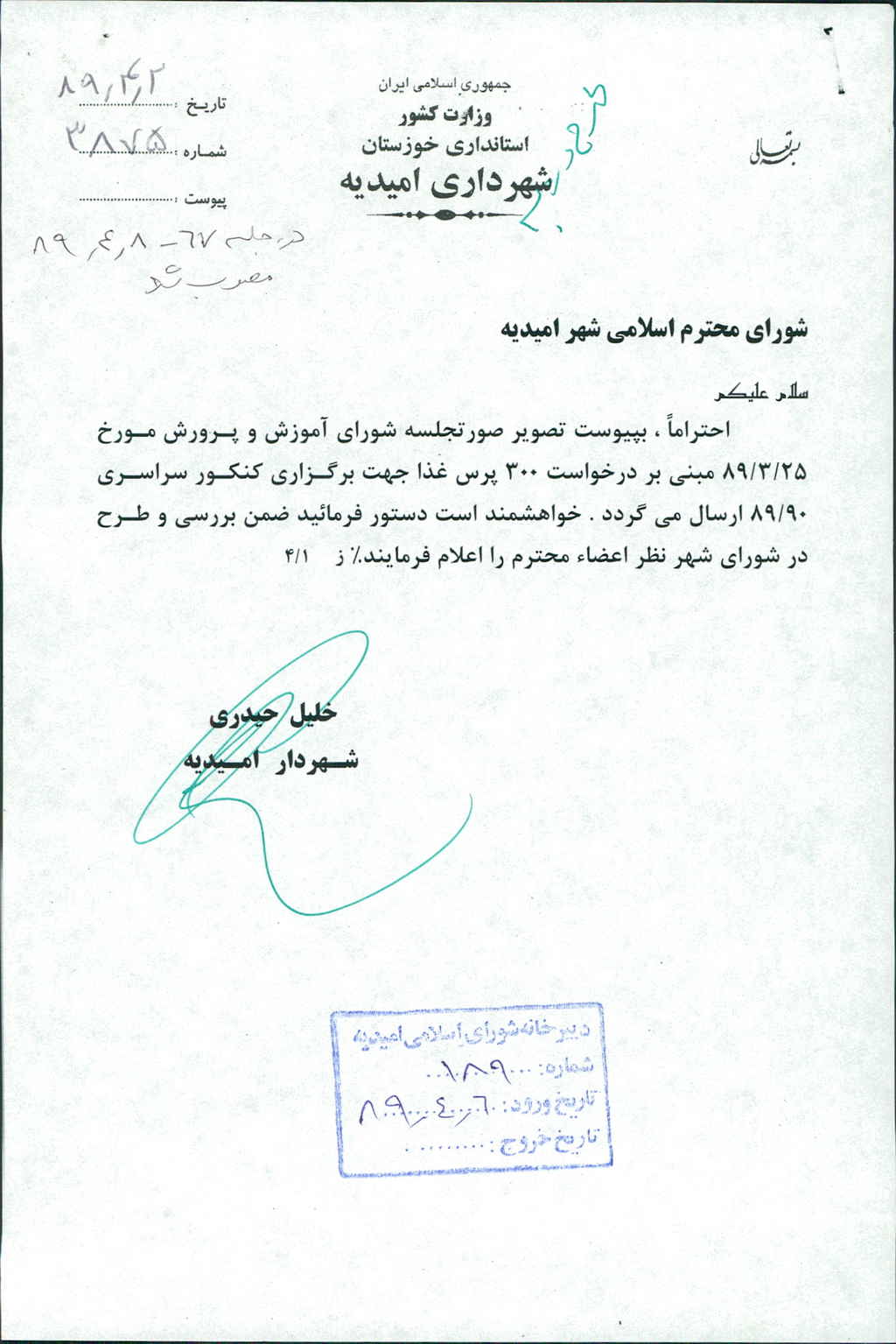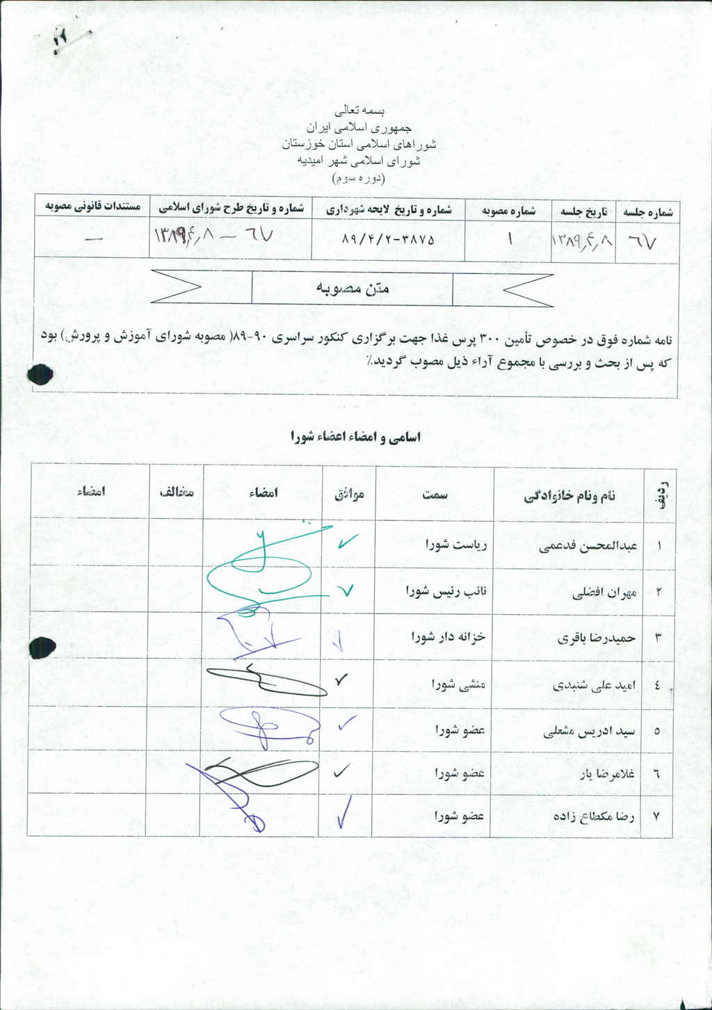 مصوبه شماره ۱ جلسه شماره ۶۷ مورخ ۸۹/۴/۸ شورای اسلامی شهر امیدیه