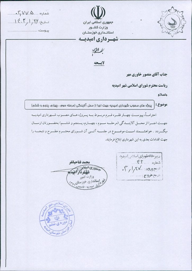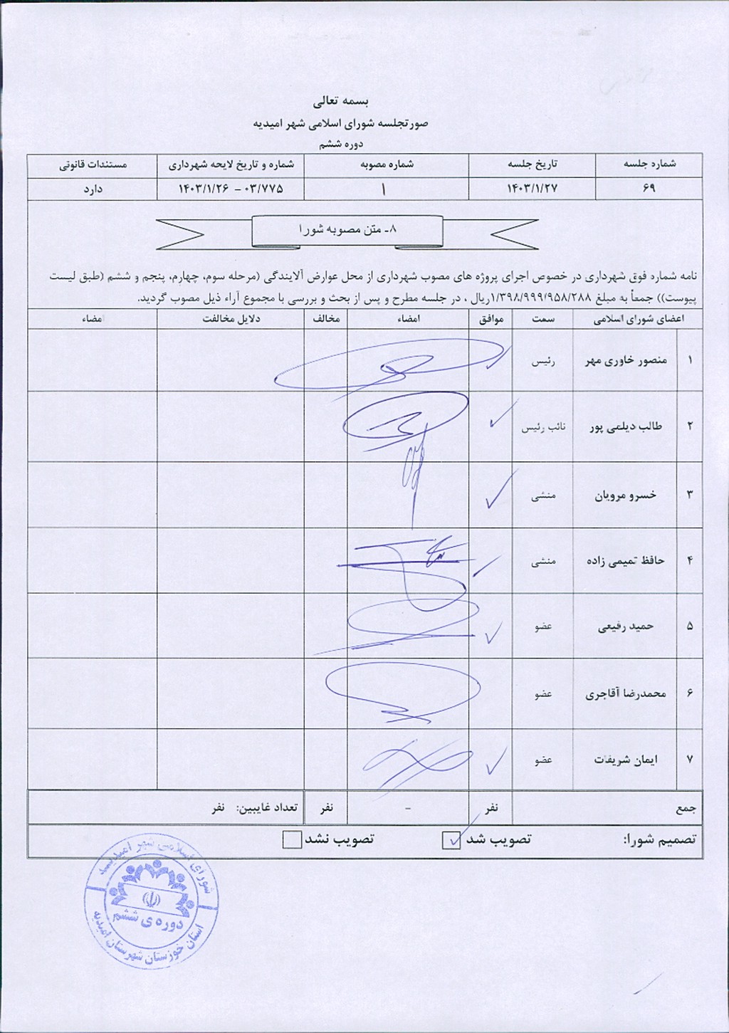 مصوبه شماره ۱ جلسه شماره ۶۹ شورای اسلامی شهر امیدیه