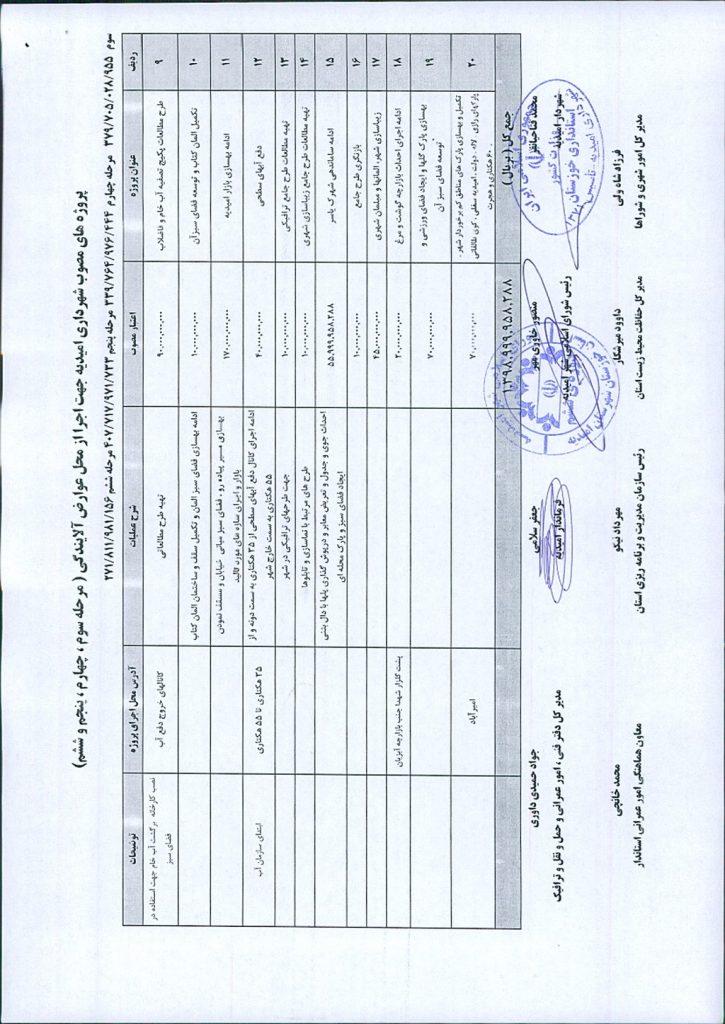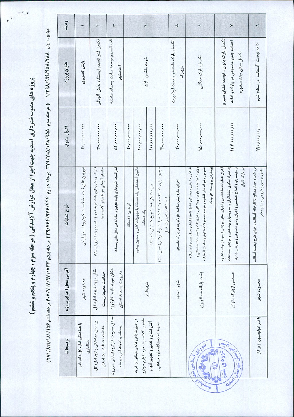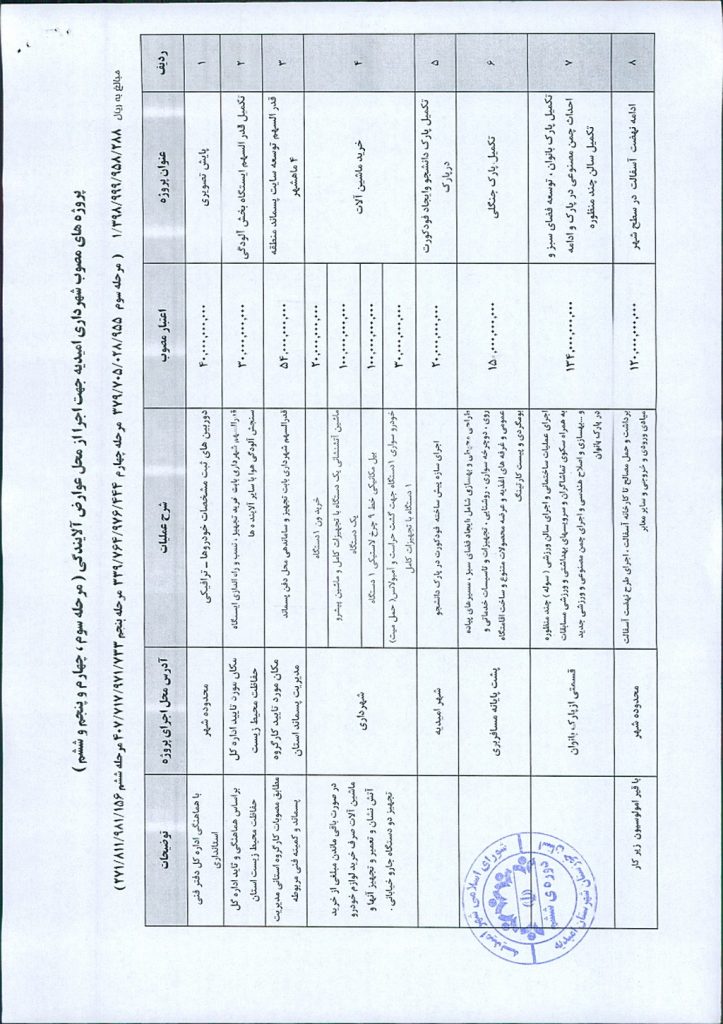 نامه شماره فوق شهرداري در خصوص اجرای پروژه های مصوب شهرداری از محل عوارض آلایندگی (مرحله سوم، چهارم، پنجم و ششم (طبق لیست پیوست)) جمعاً به مبلغ ۲۸۸/ ۹۵۸/ ۹۹۹/ ۳۹۸/ ۱ریال ، در جلسه مطرح و پس از بحث و بررسي با مجموع آراء ذيل مصوب گرديد.