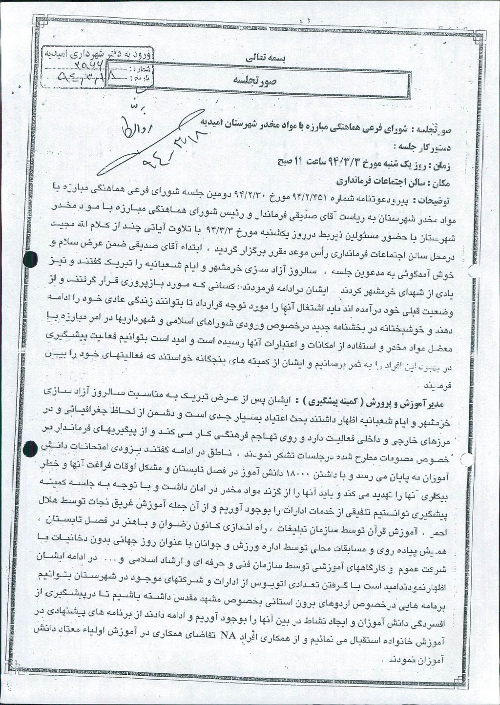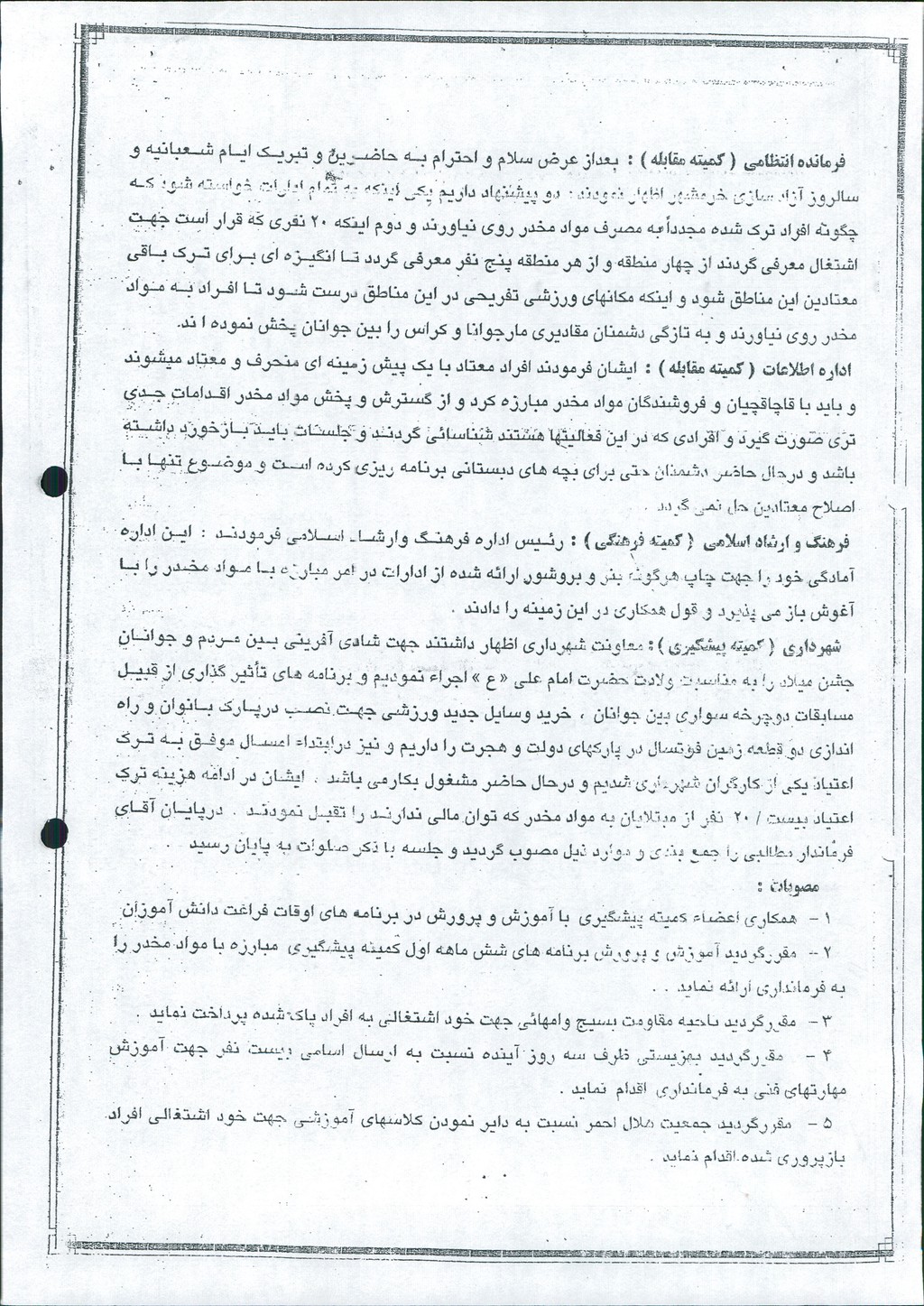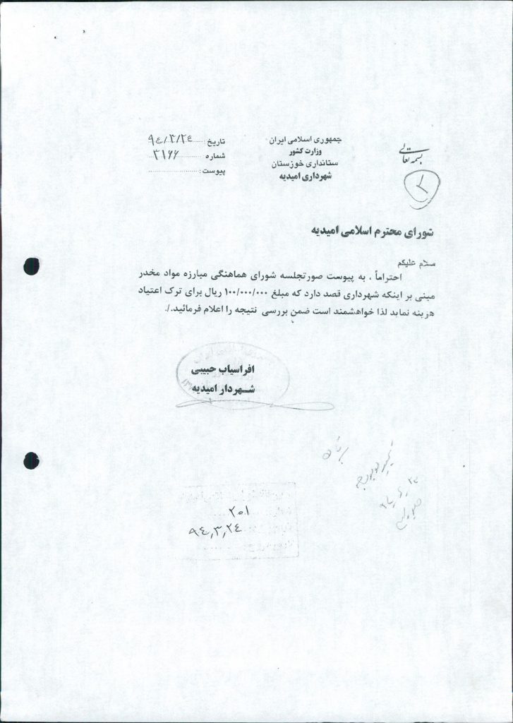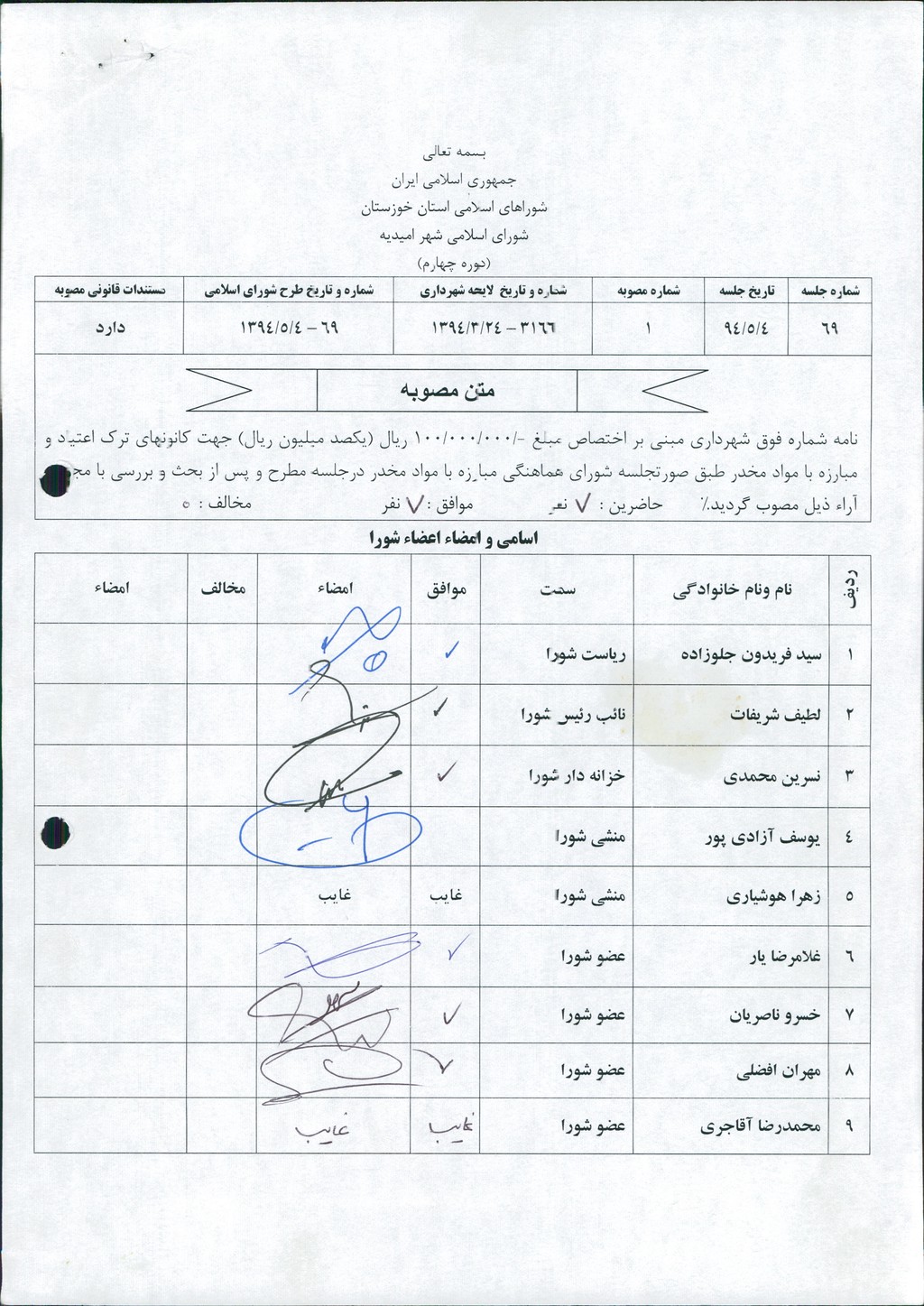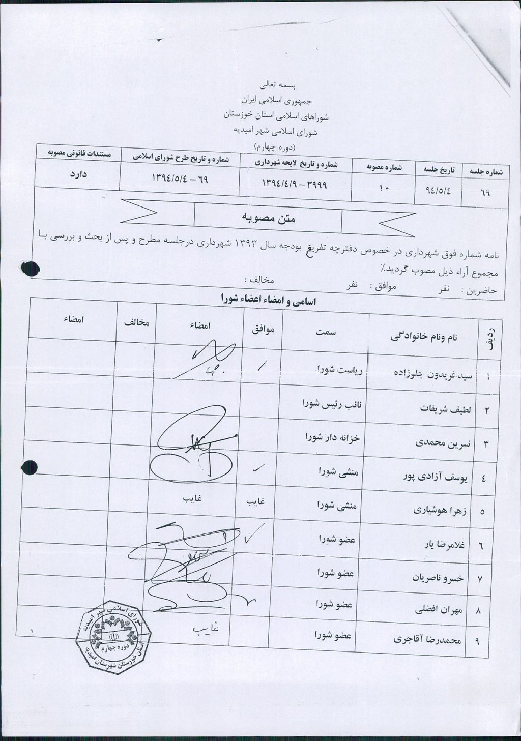 مصوبه شماره ۱ جلسه شماره ۶۹ شورای اسلامی شهر امیدیه