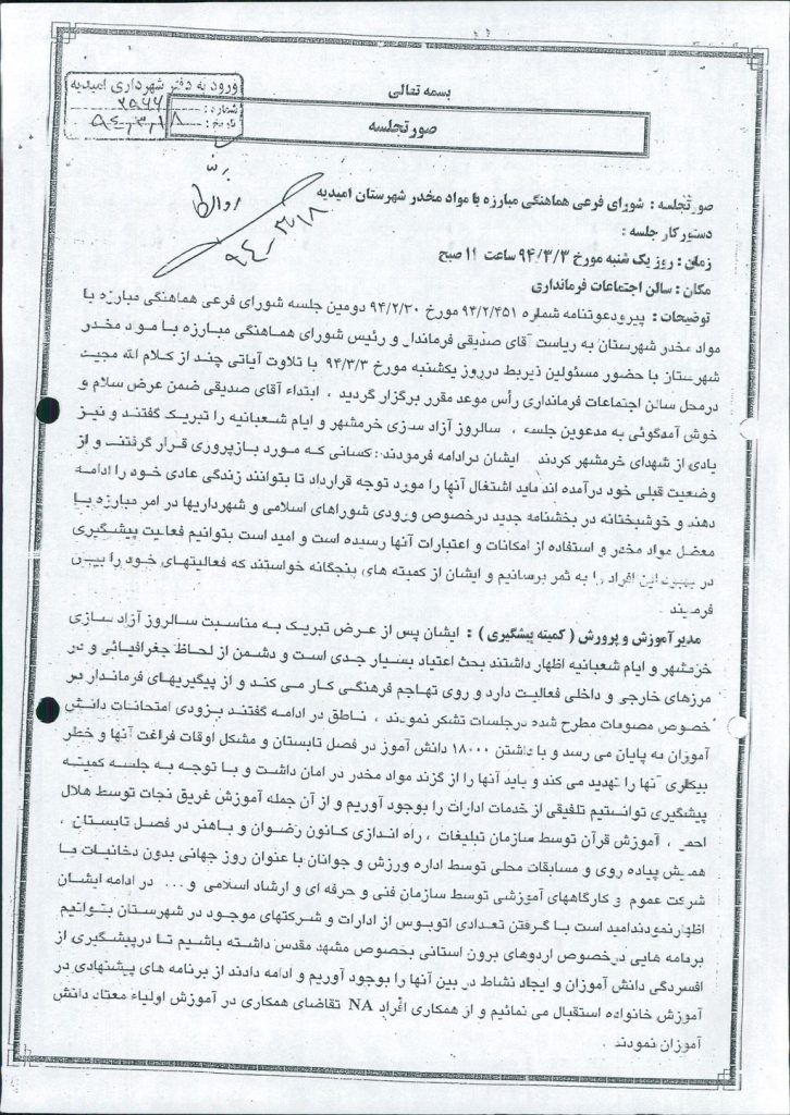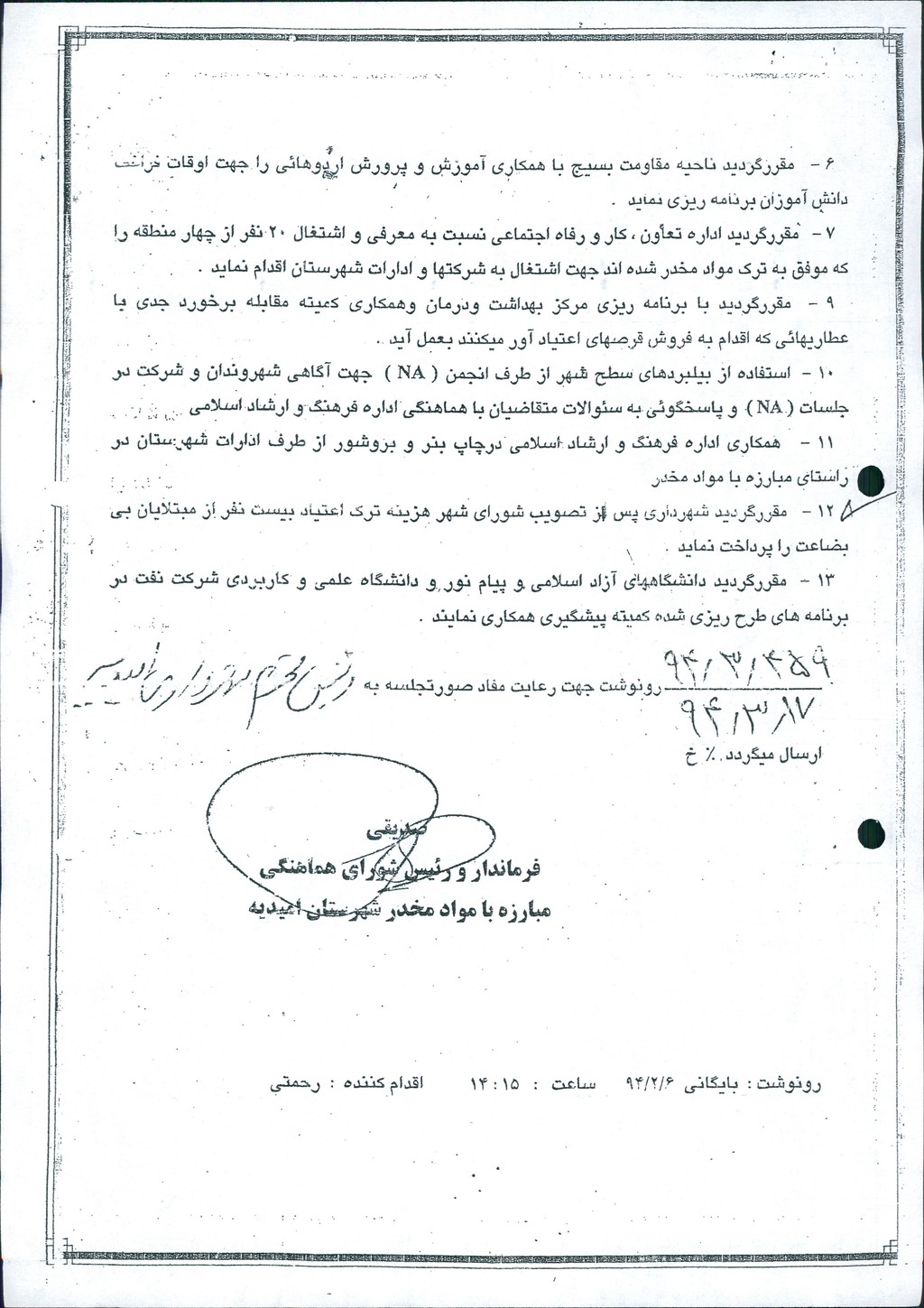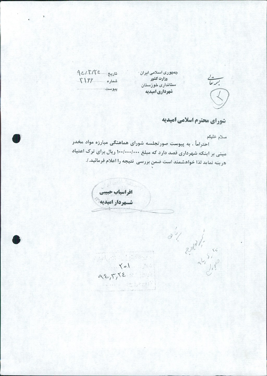 نامه شماره فوق شهرداری مبنی بر اختصاص مبلغ ۱۰۰۰۰۰۰۰۰ ریال (یکصد میلیون ریال) جهت کانونهای ترک اعتیاد و مبارزه با مواد مخدر طبق صورتجلسه شورای هماهنگی مبارزه با مواد مخدر درجلسه مطرح و پس از بحث و بررسی با مجموع آراء ذیل مصوب گردید%