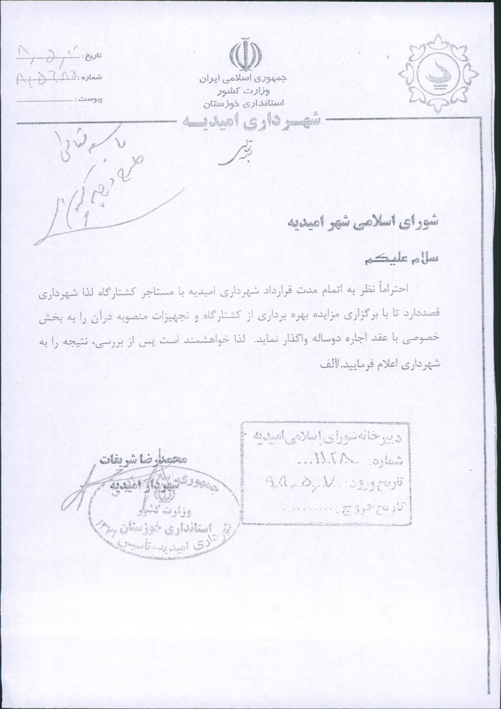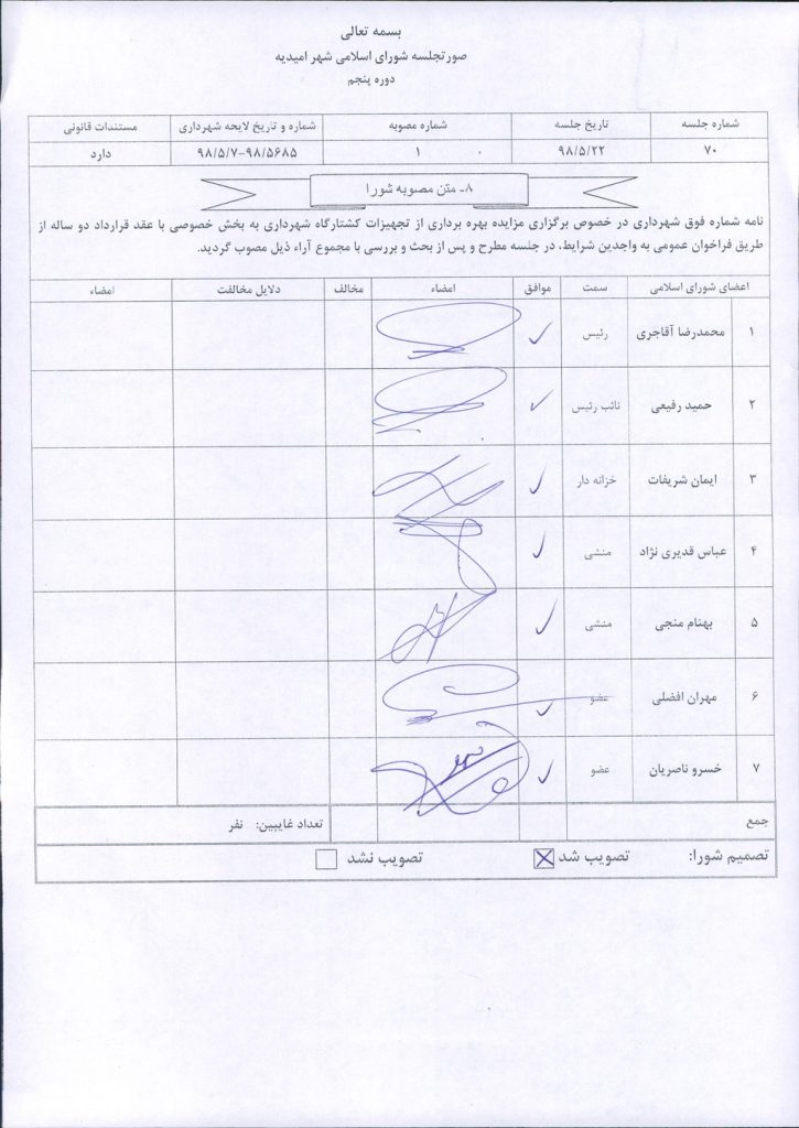 مصوبه شماره ۱ جلسه شماره ۷۰ شورای اسلامی شهر امیدیه