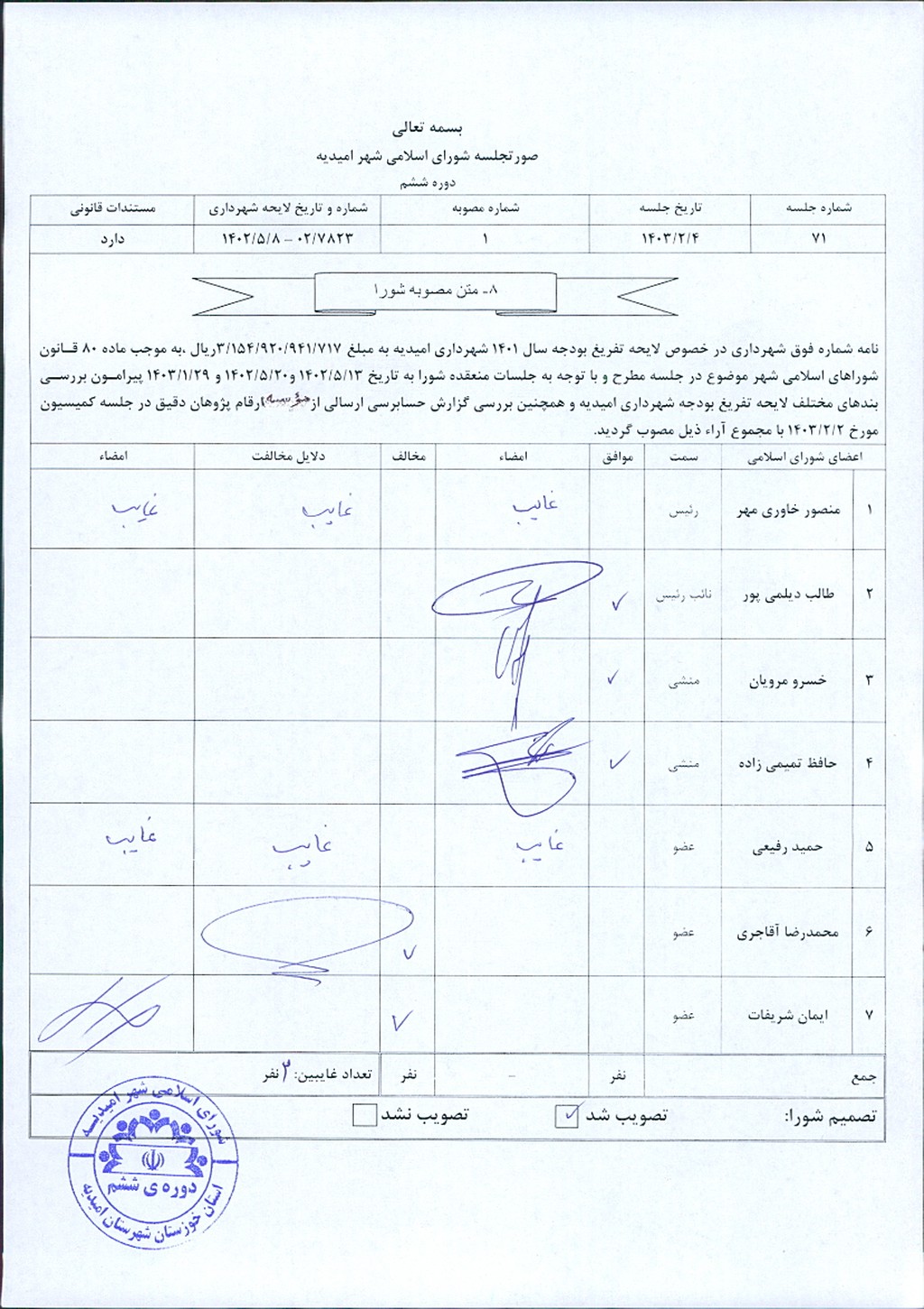 مصوبه شماره ۱ جلسه شماره ۷۱ مورخ ۱۴۰۳/۲/۴ شورای اسلامی شهر امیدیه