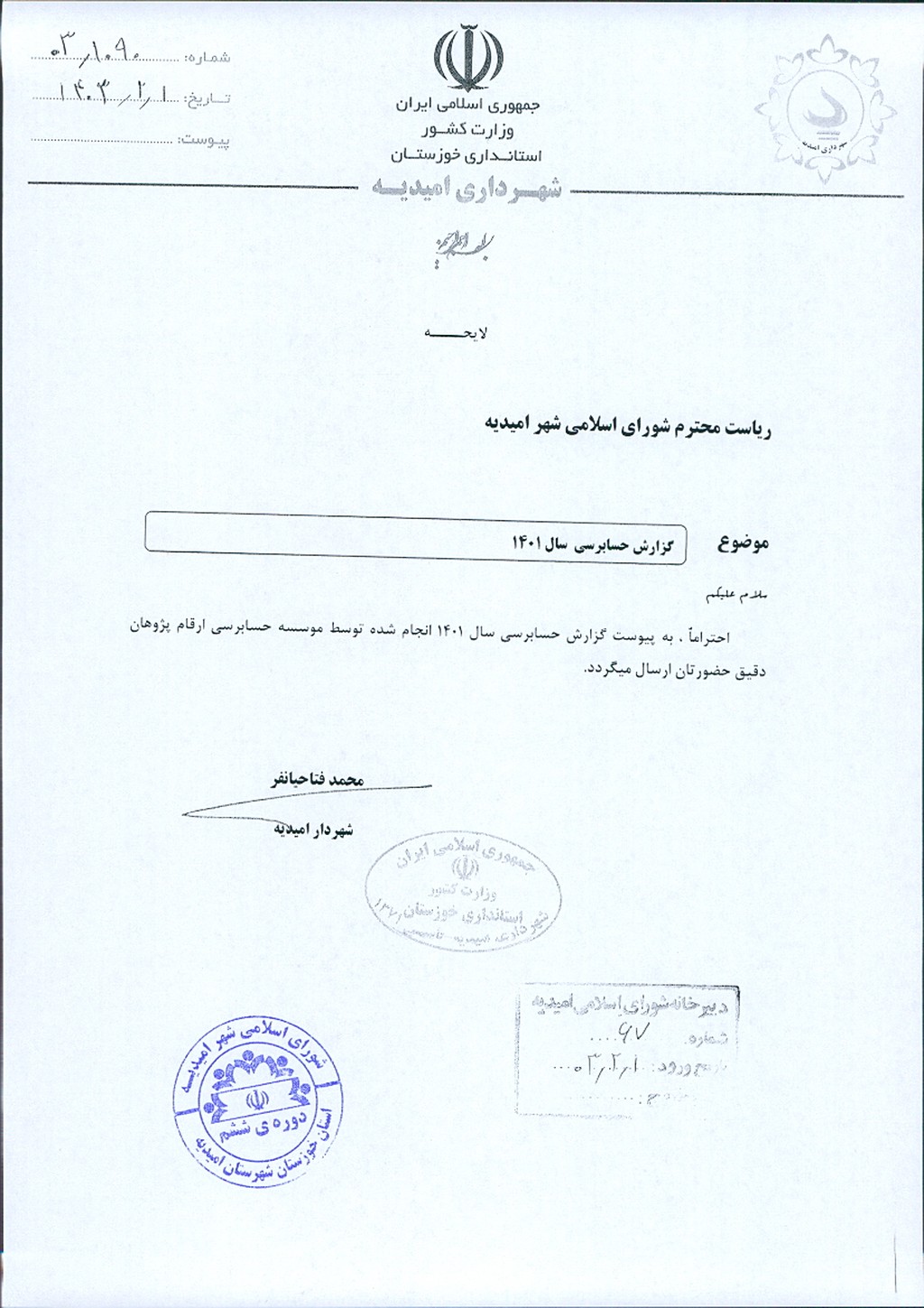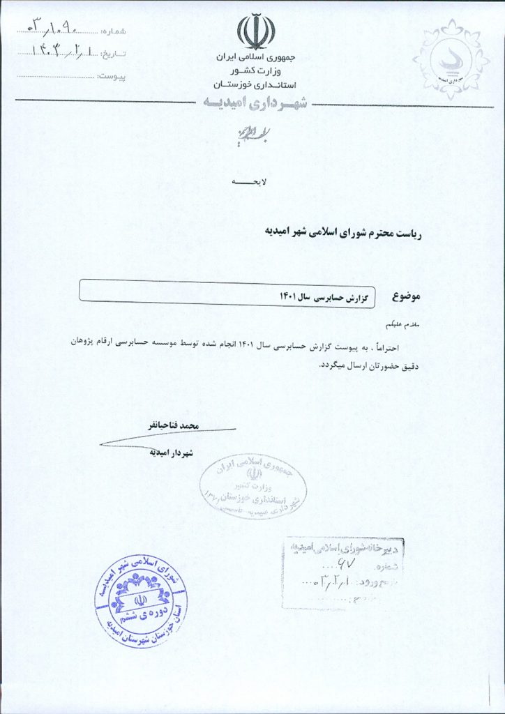نامه شماره فوق شهرداري در خصوص لایحه تفريغ بودجه سال ۱۴۰۱ شهرداري اميديه به مبلغ ۷۱۷/ ۹۴۱/ ۹۲۰/ ۱۵۴/ ۳ریال ،به موجب ماده ۸۰ قانون شوراهای اسلامی شهر موضوع در جلسه مطرح و با توجه به جلسات منعقده شورا به تاریخ ۱۳/ ۵/ ۱۴۰۲ و۲۰/ ۵/ ۱۴۰۲ و ۲۹/ ۱/ ۱۴۰۳ پیرامون بررسی بندهای مختلف لایحه تفریغ بودجه شهرداری امیدیه و همچنین بررسی گزارش حسابرسی ارسالی از شرکت ارقام پژوهان دقیق در جلسه کمیسیون مورخ ۲/۲/ ۱۴۰۳ با مجموع آراء ذيل مصوب گرديد.